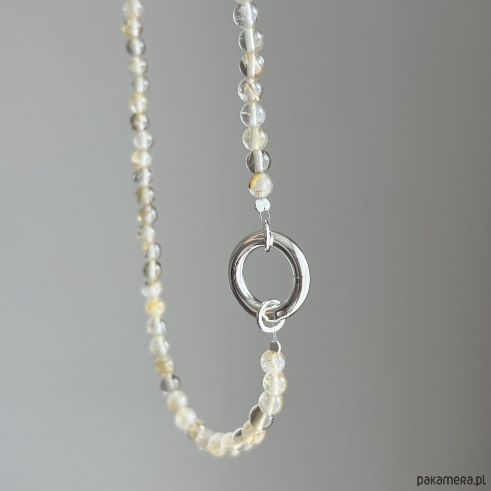 Ten naszyjnik z kul kwarcu rutylowego przyciąga wzrok dzięki delikatnej, złotej nici zamkniętej w strukturze kamienia. Kwarc rutylowy w odcieniu ciepłej żółci to kamień o naturalnym, subtelnym blasku i energetycznym charakterze – idealny jako element codziennych lub wyjątkowych stylizacji.
