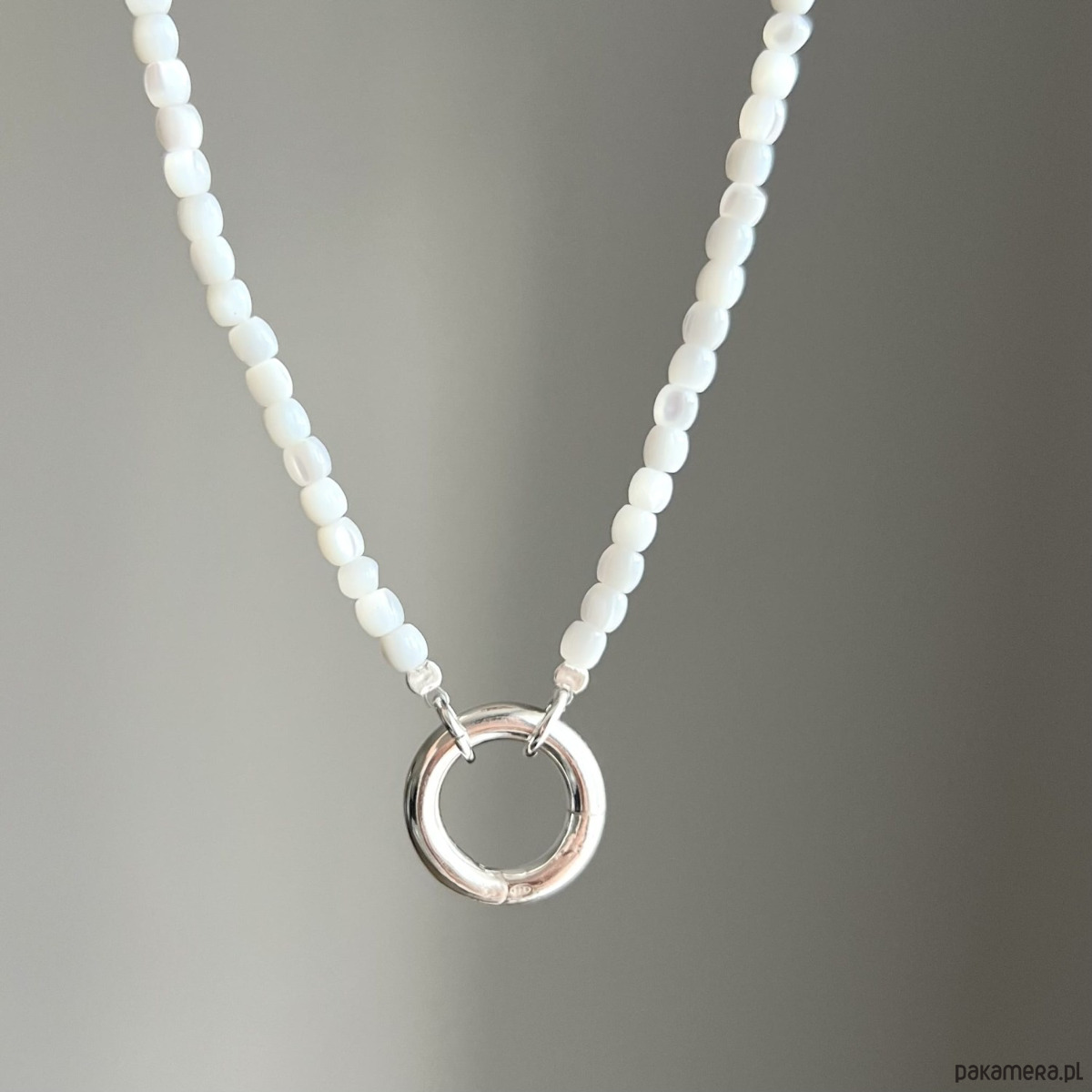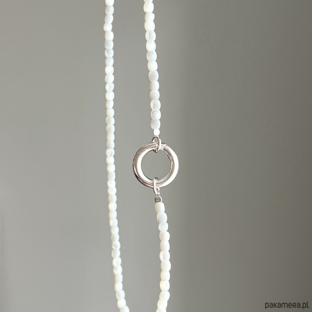 Naszyjnik z masy perłowej o mlecznobiałym połysku, wykonany z naturalnych komponentów.Wykończony charakterystycznym zapięciem w formie koła dostępny w wersji srebrnej lub srebrne pozłacanej 24 karatowym złotem