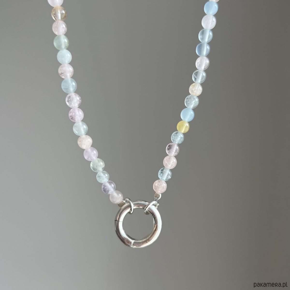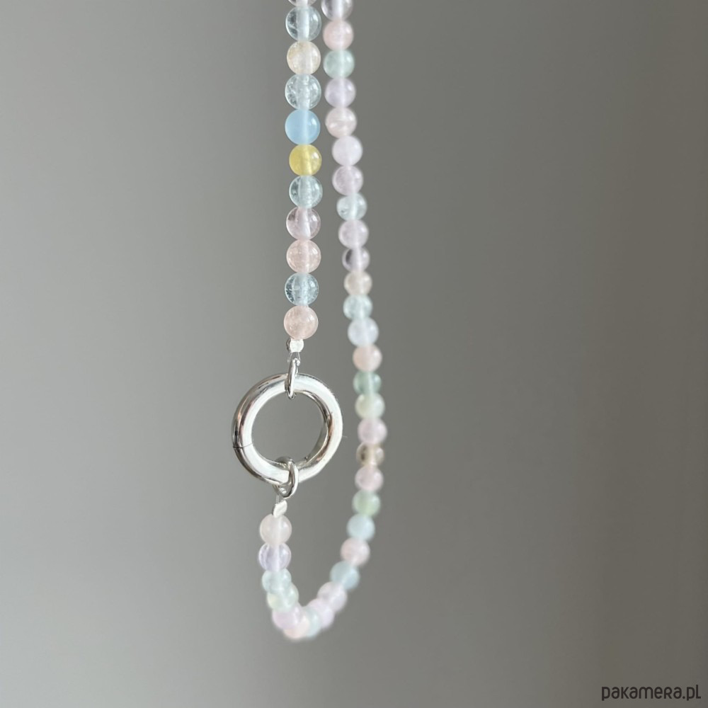 Ten wyjątkowy naszyjnik wykonany został z naturalnych kamieni morganitu o pastelowych odcieniach – delikatnego różu, subtelnego błękitu, brzoskwini, zieleni i bieli. To połączenie kolorów tworzy lekką, kobiecą kompozycję, która przyciąga wzrok i dodaje wdzięku każdej stylizacji.