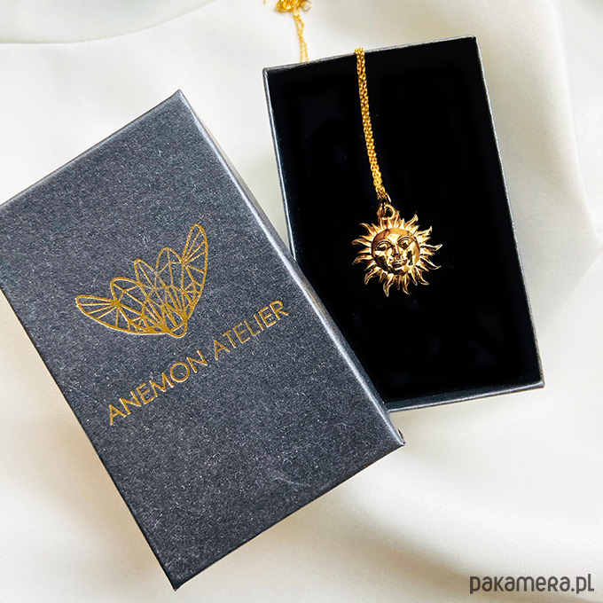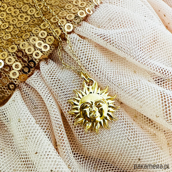 Oryginalny naszyjnik z zawieszką w kształcie wypukłego słońca z twarzą, zachwycający niezwykłą dbałością o detale. Złote słońce zostało oddane bardzo szczegółowo, z wyraźnie zarysowanymi rysami i promieniami, dzięki czemu biżuteria ma wyjątkowy, artystyczny charakter.
