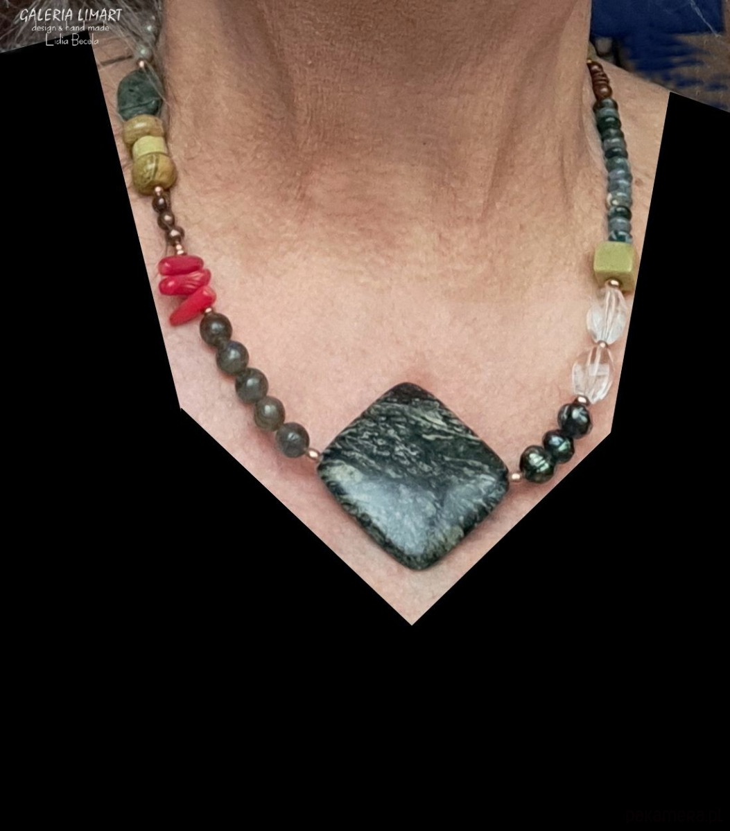 Niezwyczajny, efektowny swą unikatowością, spektakularny naszyjnik, który powstał dzięki unikatowej kompozycji przeróżnych minerałów w odcieniach zieleni (oliwin, turkus afrykański, chryzopraz, agat mszysty) plus labradoryt, perły, koral, kryształ górski, a centralnie duży 3,5 x 3,5 jaspis kambaba. Dodatkowe subtelne ozdoby z miedzi. Minerały zostały bardzo starannie dobrane i dopasowane w przepięknej niebanalnej kolorystyce w taki sposób by powstał piękny unikatowy naszyjnik jedyny w swoim rodzaju. Długość (ok. 47 cm). Ten przemyślany melanż minerałów została tak stworzony by powstał stylowy naszyjnik dla eleganckiej kobiety, która doceni jego urodę.