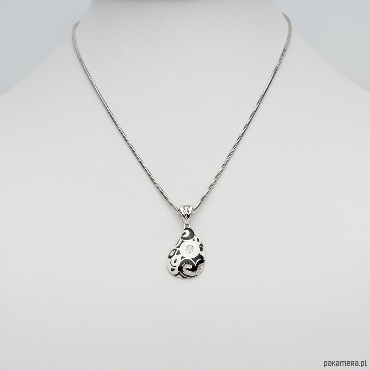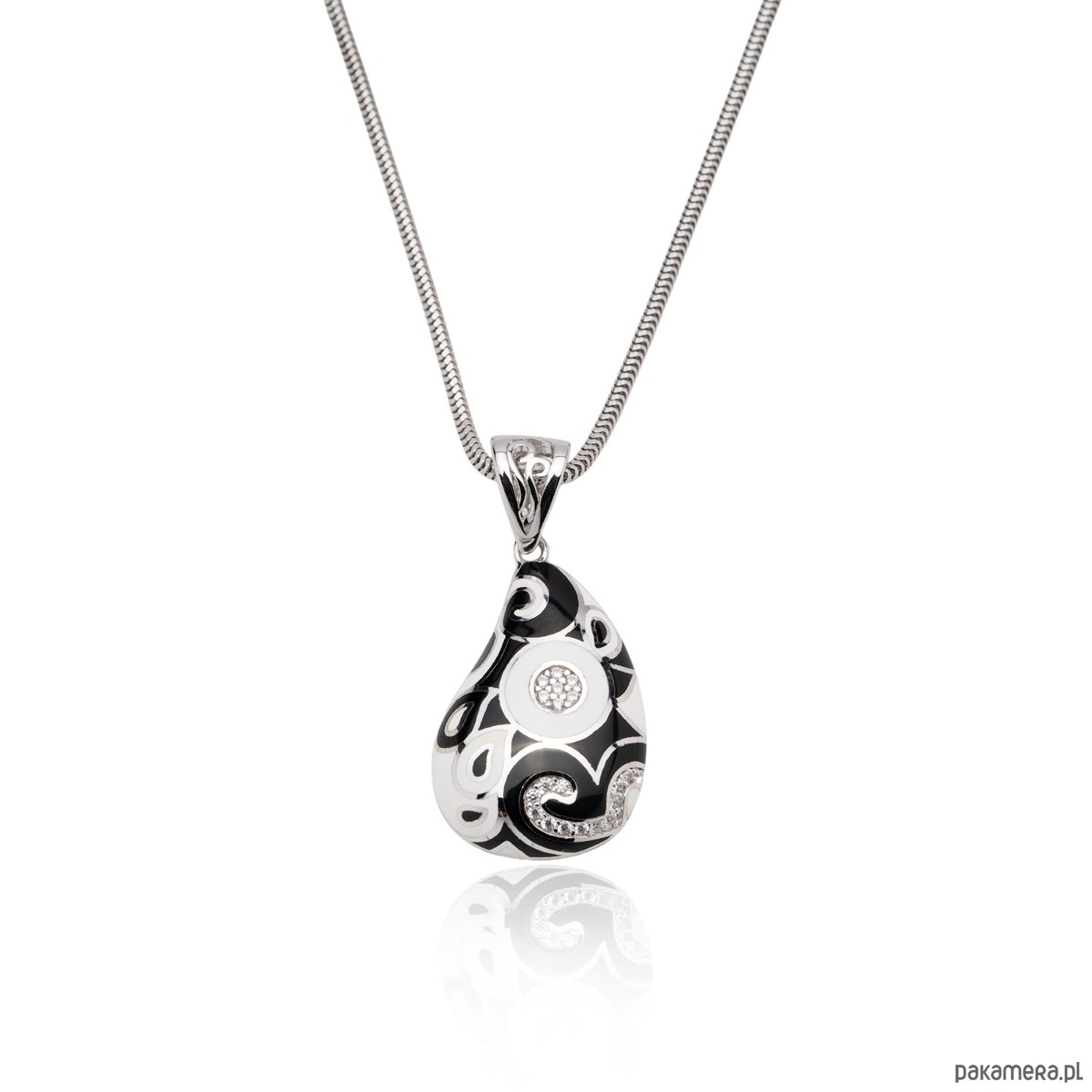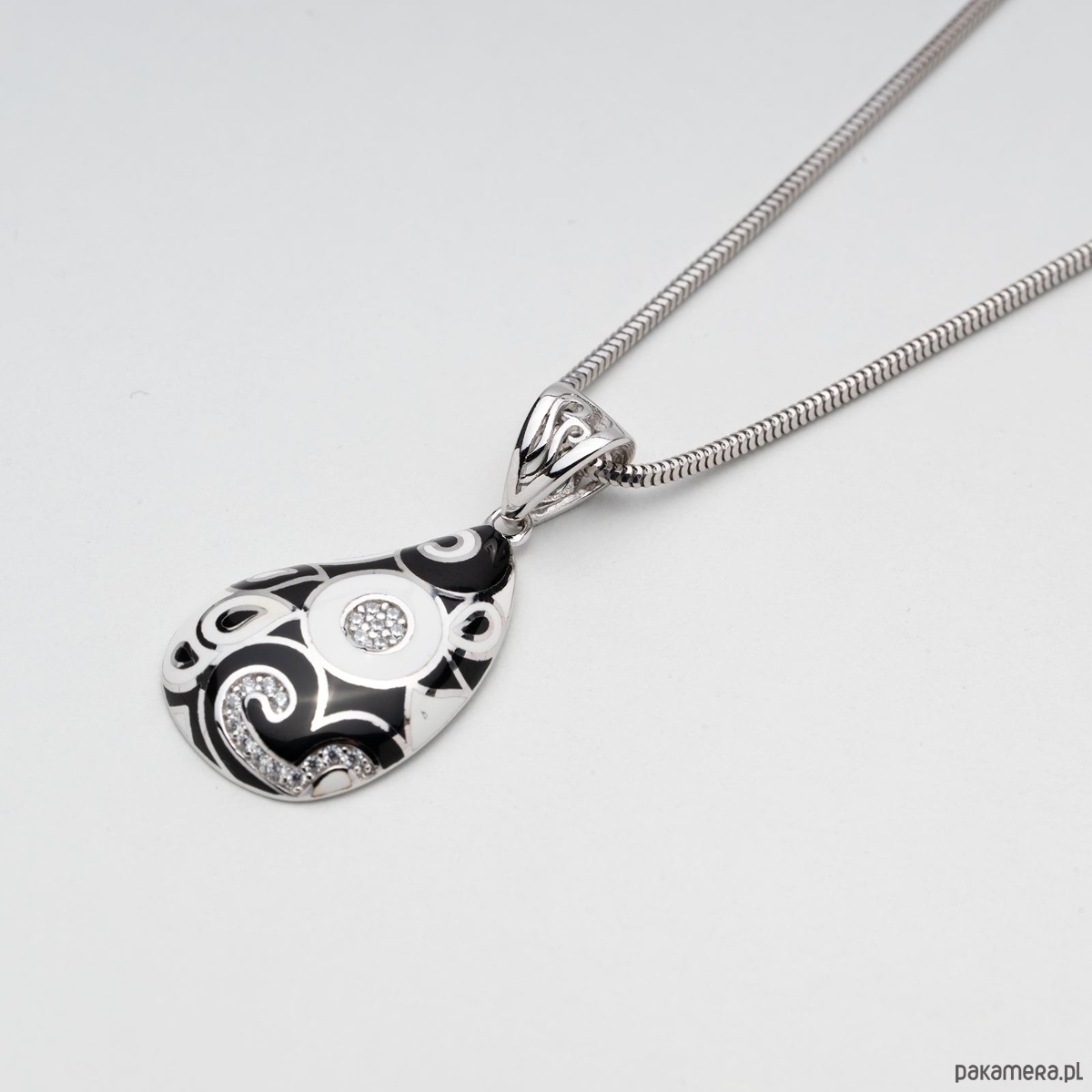 Naszyjnik ze srebra 925 rodowany z cyrkoniami i czarno białą emalią