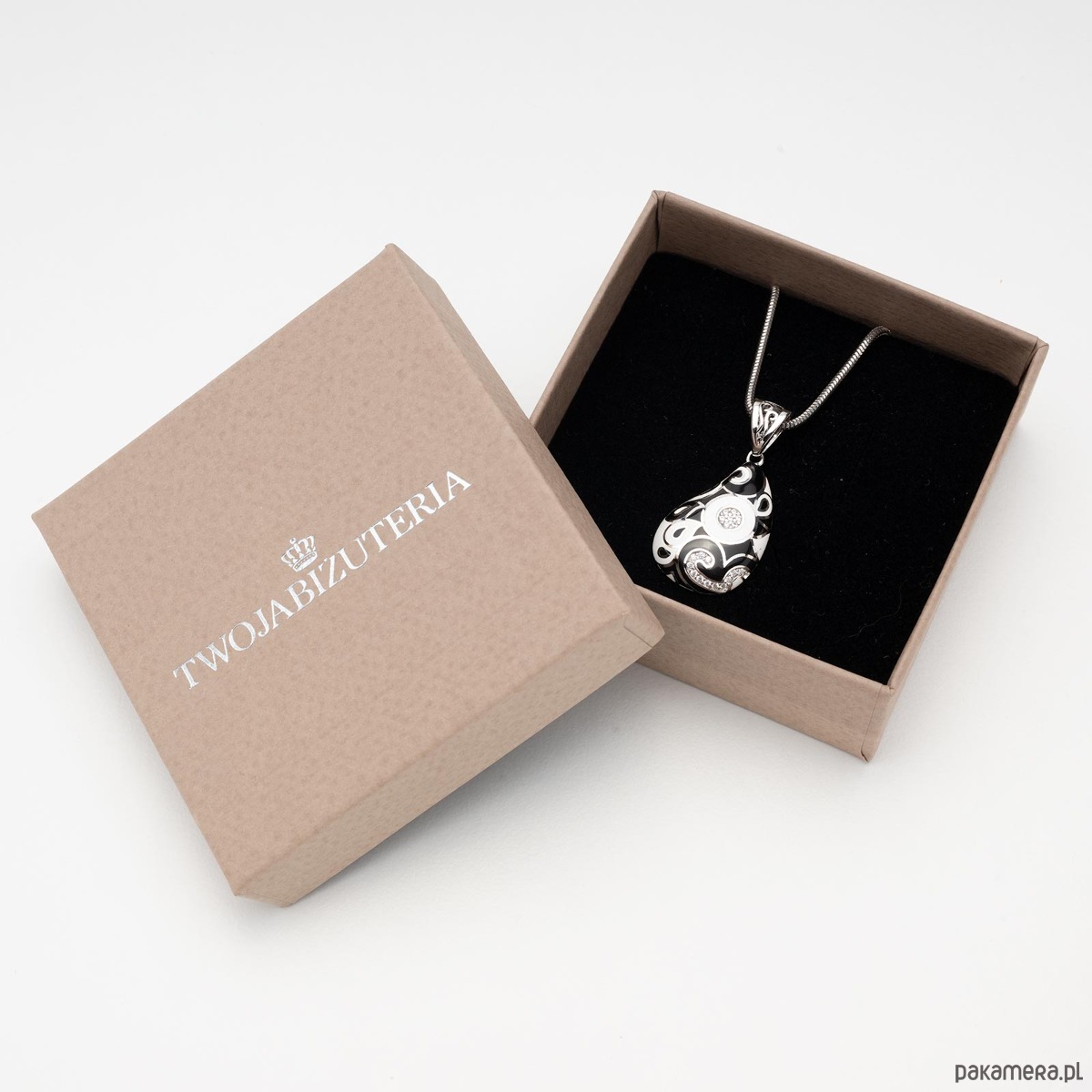 Biżuteria składa się z delikatnego łańcuszka (np. srebrnego rodowanego próby 925) ozdobionego zawieszką wysadzaną białymi i czarnymi cyrkoniami,