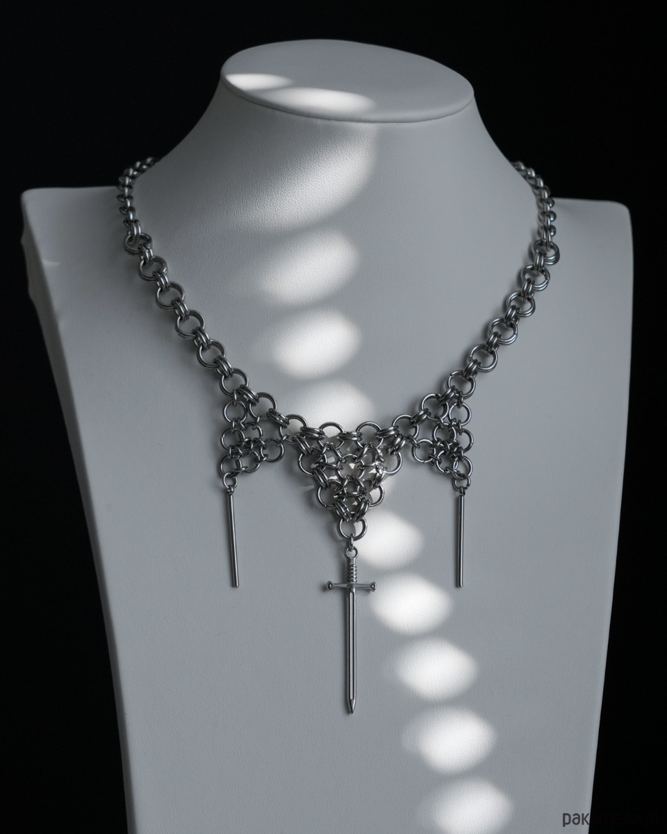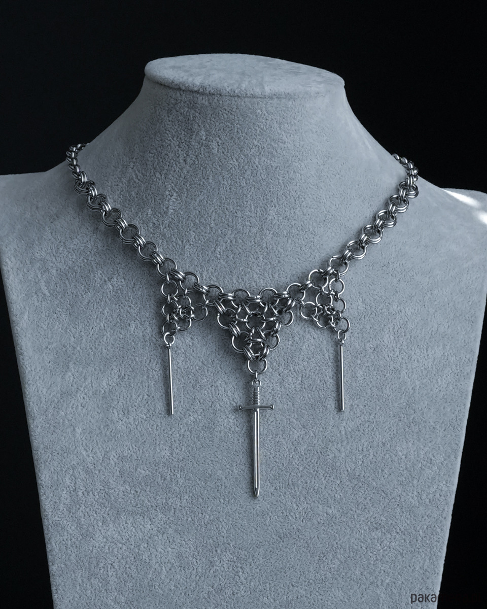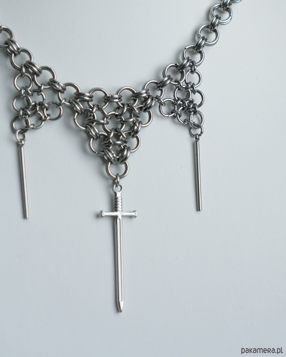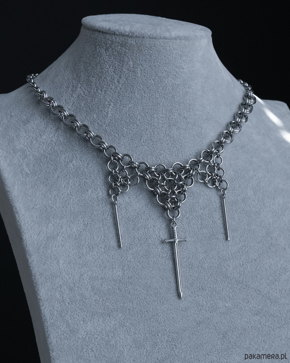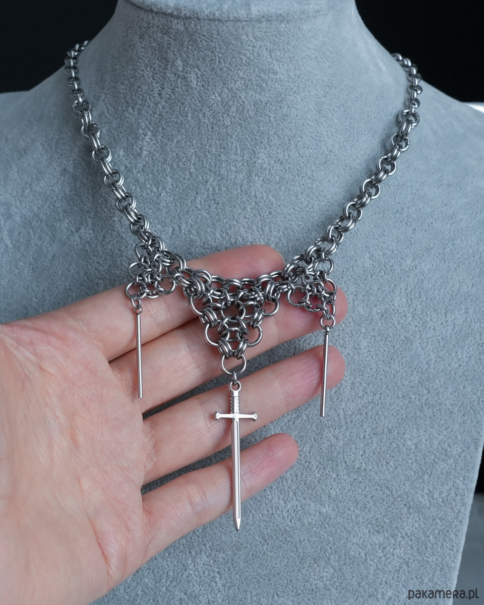 Nowoczesny i oryginalny naszyjnik wykonany ręcznie z wykorzystaniem techniki chainmaille. Głównym elementem naszyjnika jest zawieszka w kształcie miecza.