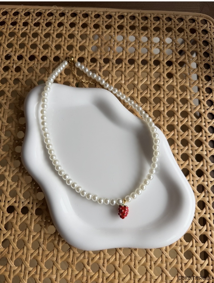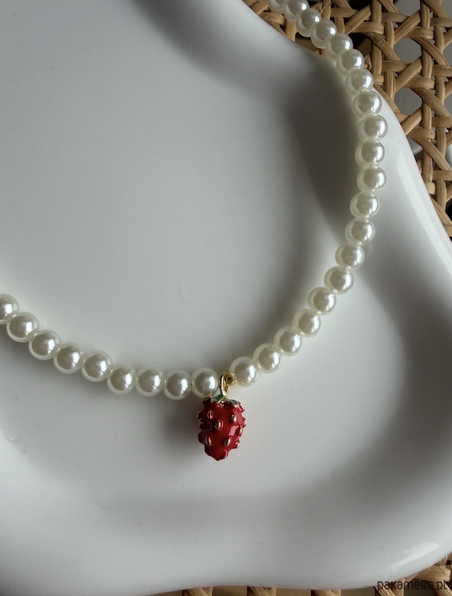 Ręcznie robiony naszyjnik ze sztucznych perełek z truskawką.