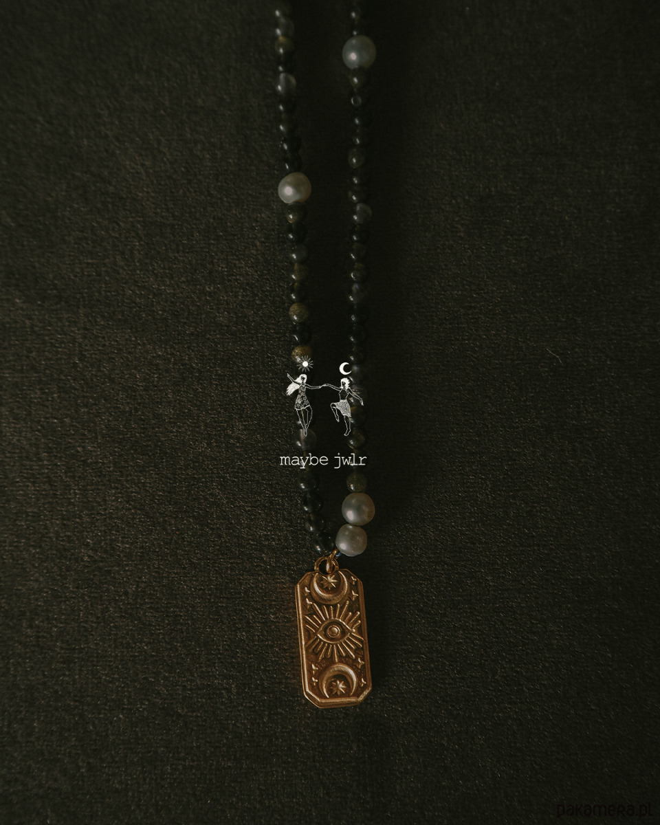 Naszyjnik z obsydianu ze złotymi refleksami i zawieszką.