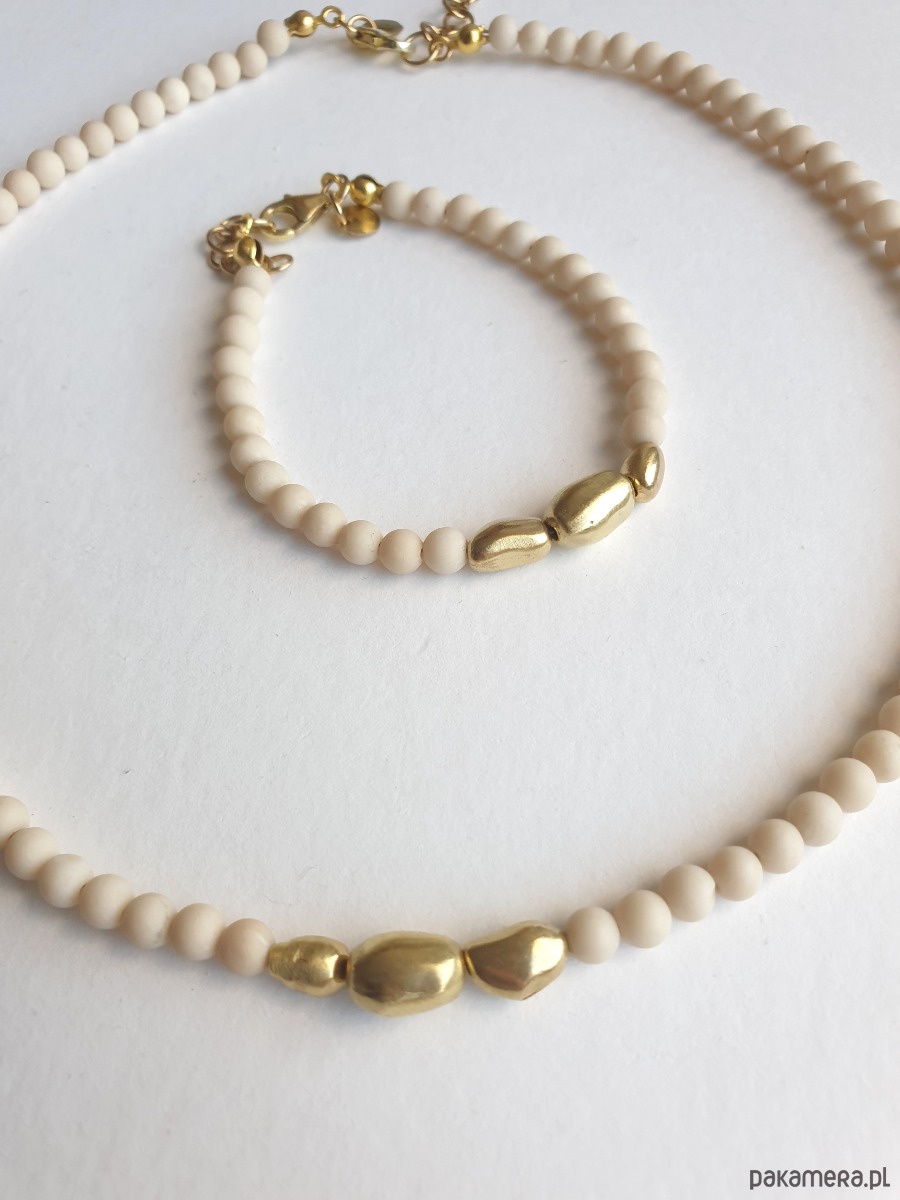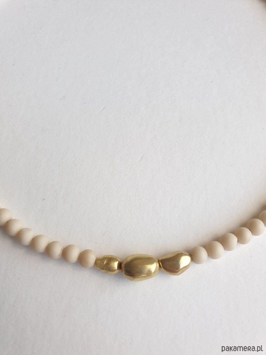 Naszyjnik tworzony ręcznie z kamieni naturalnych, tutaj jaspis river (kamień rzeczny) i nieregularnych elementów z surowego mosiądzu, ręcznie formowanych i matowionych (każdy egzemplarz unikatowy). Na zdjęciu przykładowy naszyjnik, tworzę je z tych samych kamyczków i elementów, ale mogą być minimalne różnice w odcieniu kamienia i formie elementów z mosiądzu.