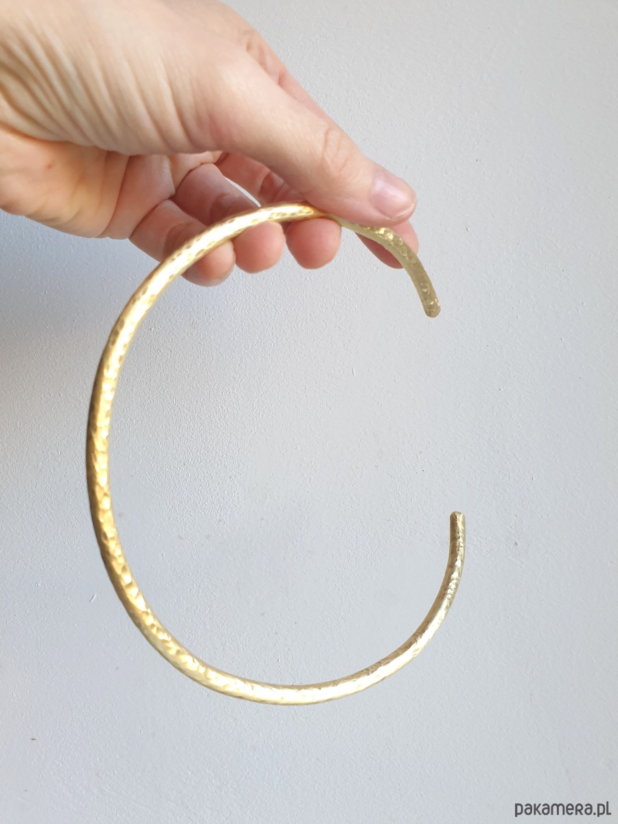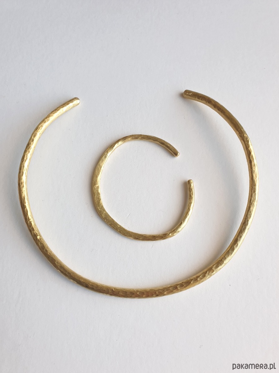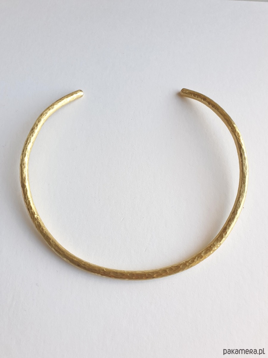 Choker, sztywna obróżka tworzona ręcznie z surowego mosiądzu, ręcznie formowana, młotkowana i matowiona (każdy egzemplarz unikatowy). Na zdjęciu przykładowy naszyjnik, tworzę go na zamówienie. Naszyjnik można dopasować do szyji delikatnie rozginając, ściskając.