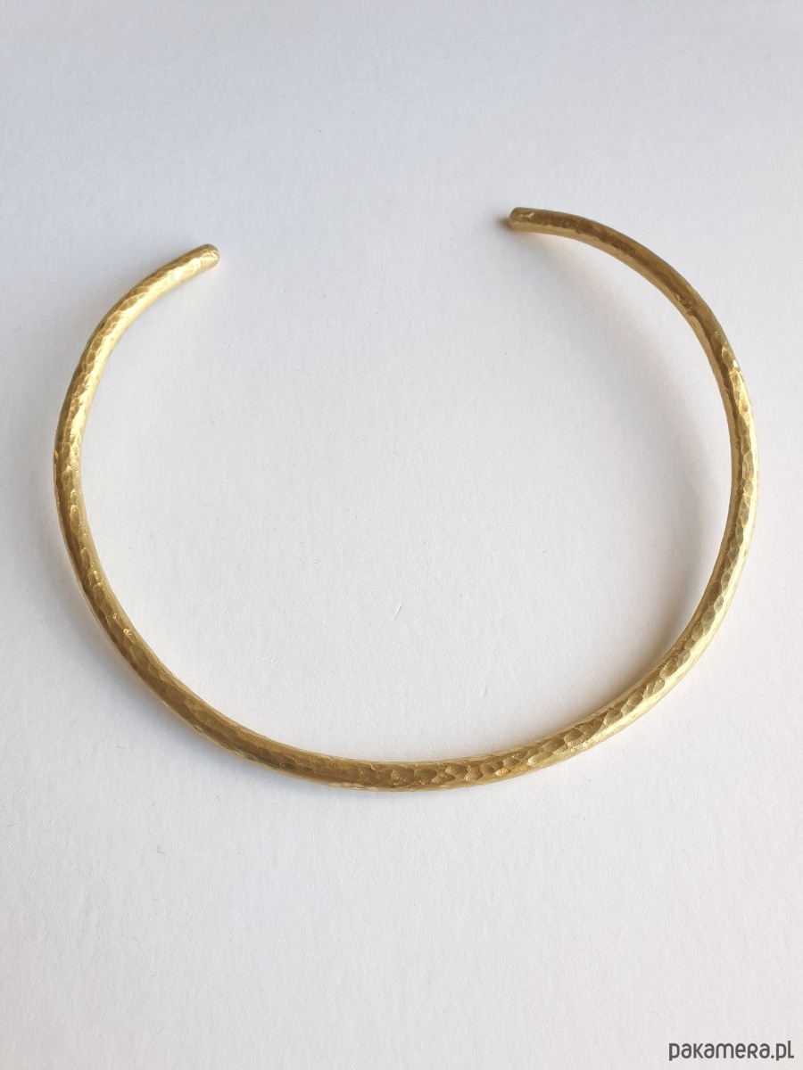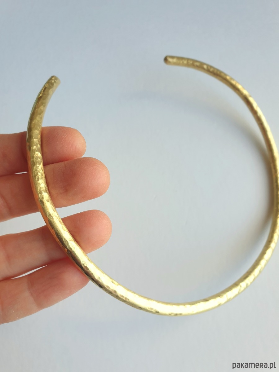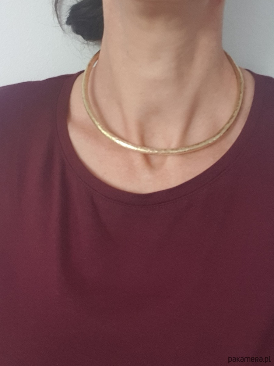 Choker, sztywna obróżka tworzona ręcznie z surowego mosiądzu, ręcznie formowana, młotkowana i matowiona (każdy egzemplarz unikatowy). Na zdjęciu przykładowy naszyjnik, tworzę go na zamówienie. Naszyjnik można dopasować do szyji delikatnie rozginając, ściskając.