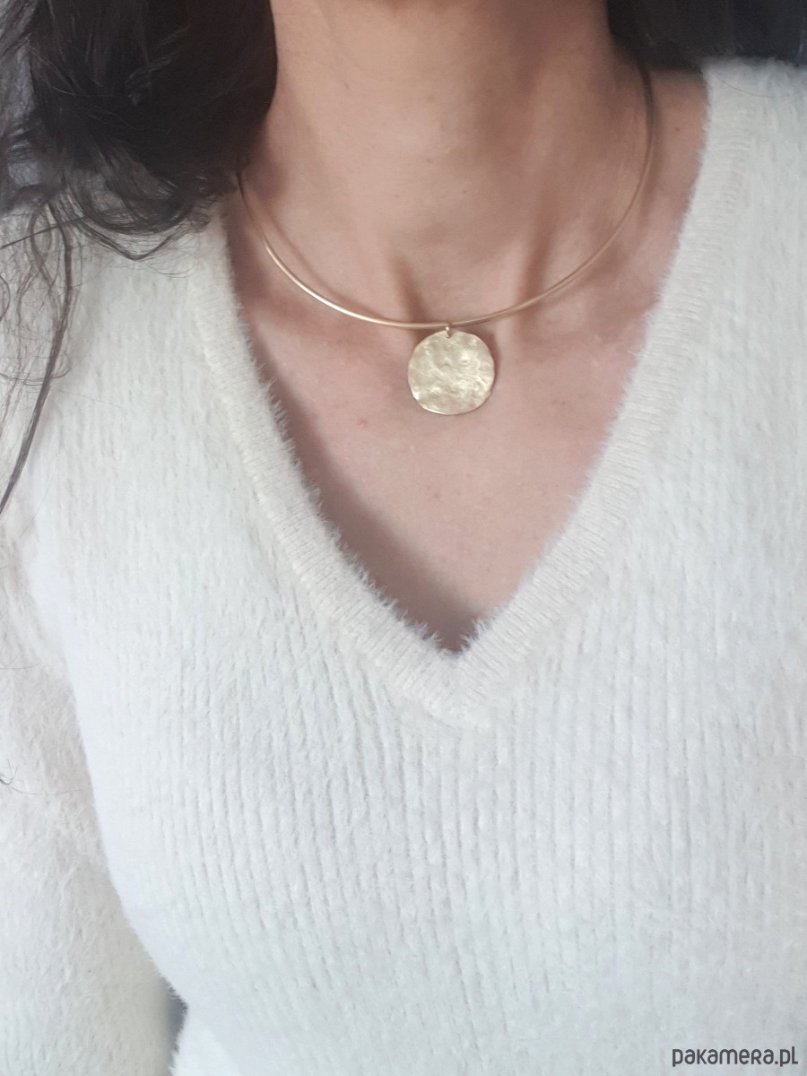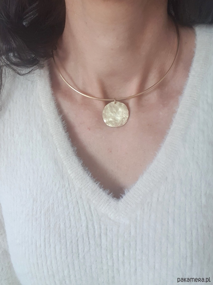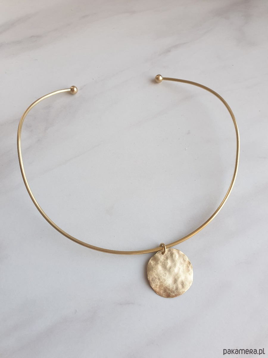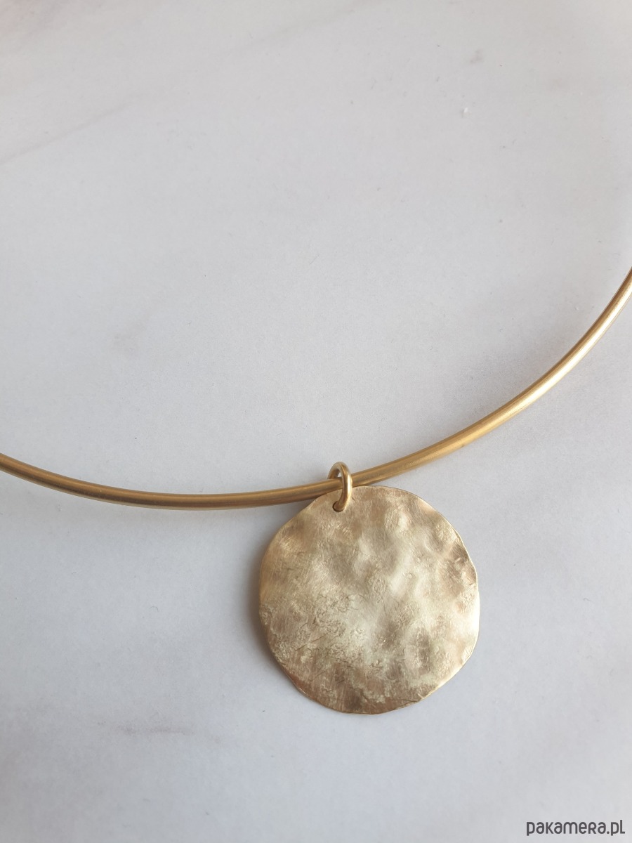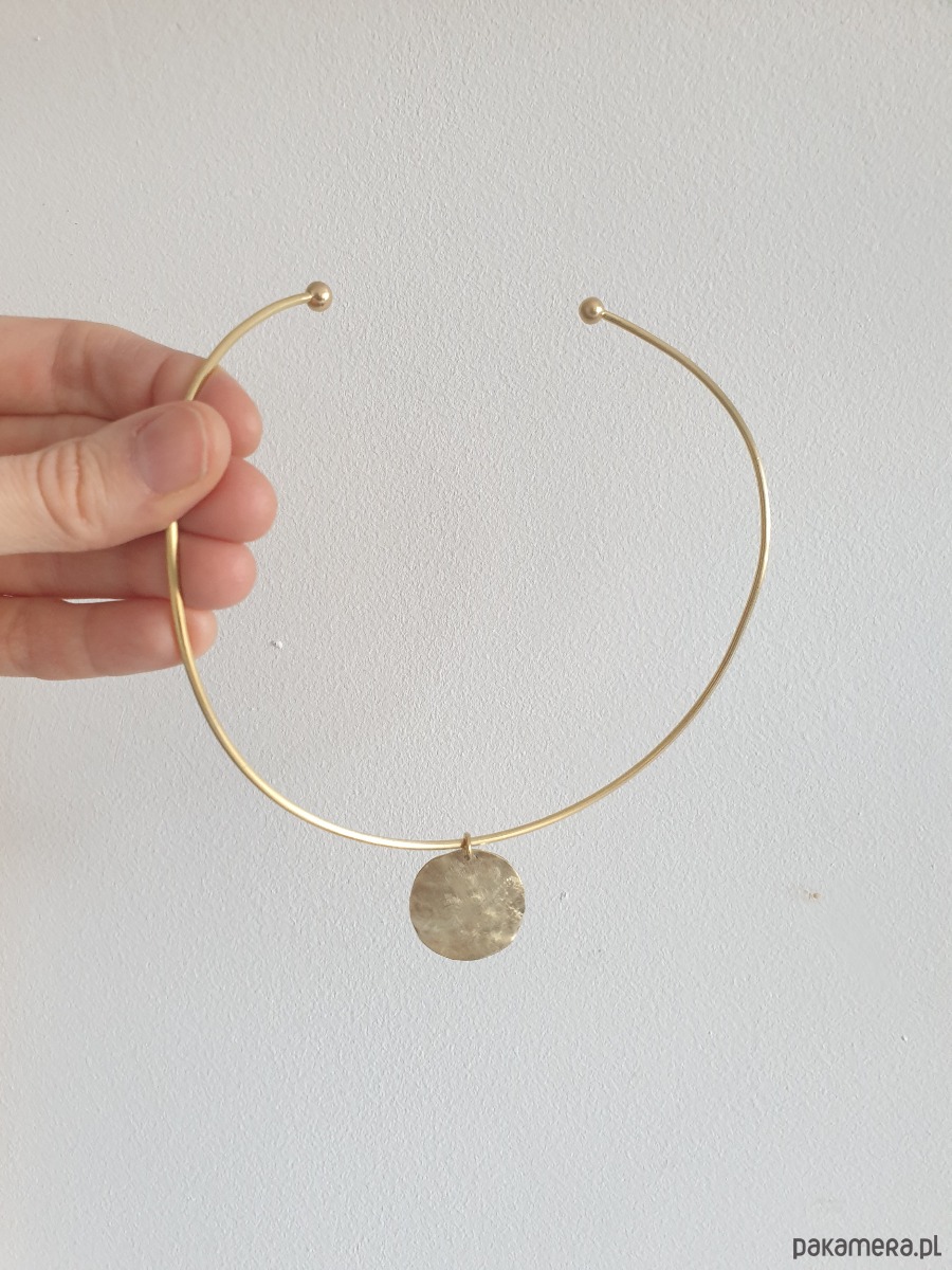 Choker, sztywna obróżka z surowego mosiądzu, z ręcznie formowanym wisiorem w kształcie okręgu, młotkowany i matowiony (każdy egzemplarz unikatowy). Na zdjęciu przykładowy naszyjnik, tworzę go na zamówienie. Naszyjnik można bez problemu dopasować do szyji delikatnie rozginając, ściskając. Można sobie wymieniać wisiorki bo kulki na zakończeniach są odkręcane jak śrubki.