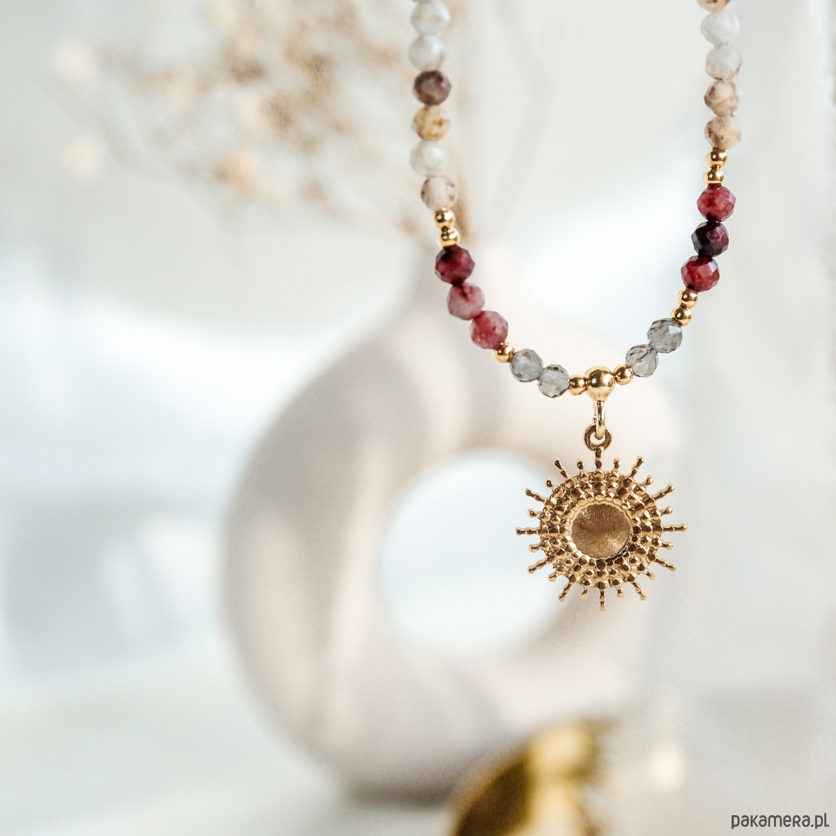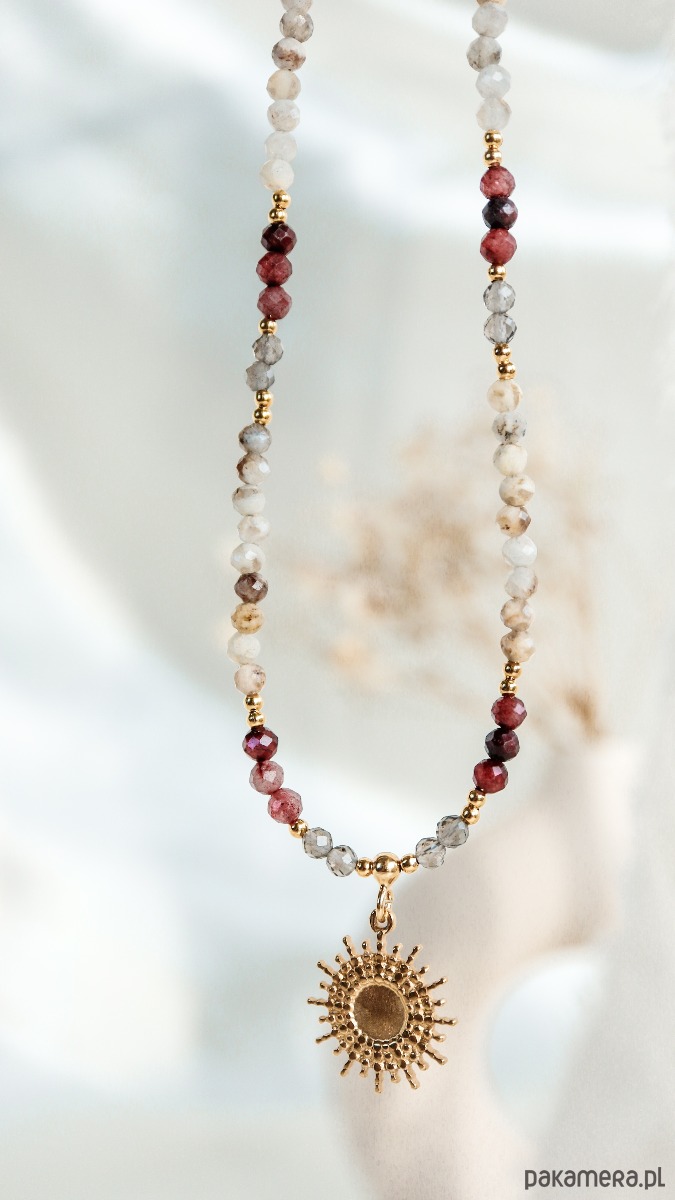 Centralna zawieszka w formie słonecznego amuletu symbolizuje światło, życiową energię i ochronę. To naszyjnik-talizman, który możesz nosić blisko serca jako subtelne wsparcie w codziennym rytmie.