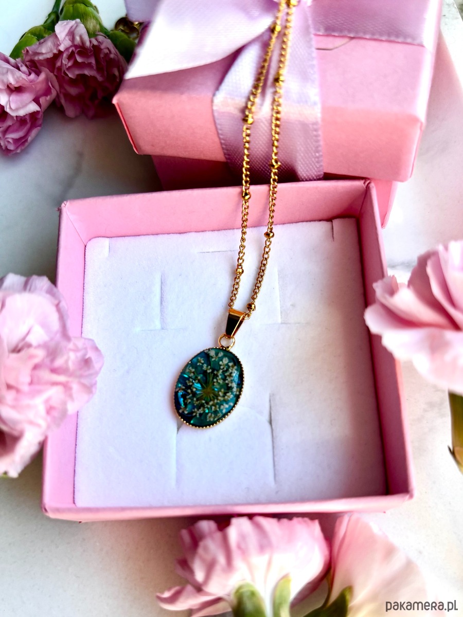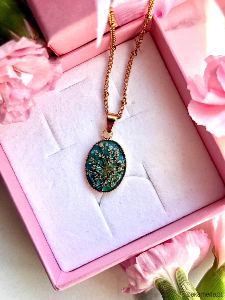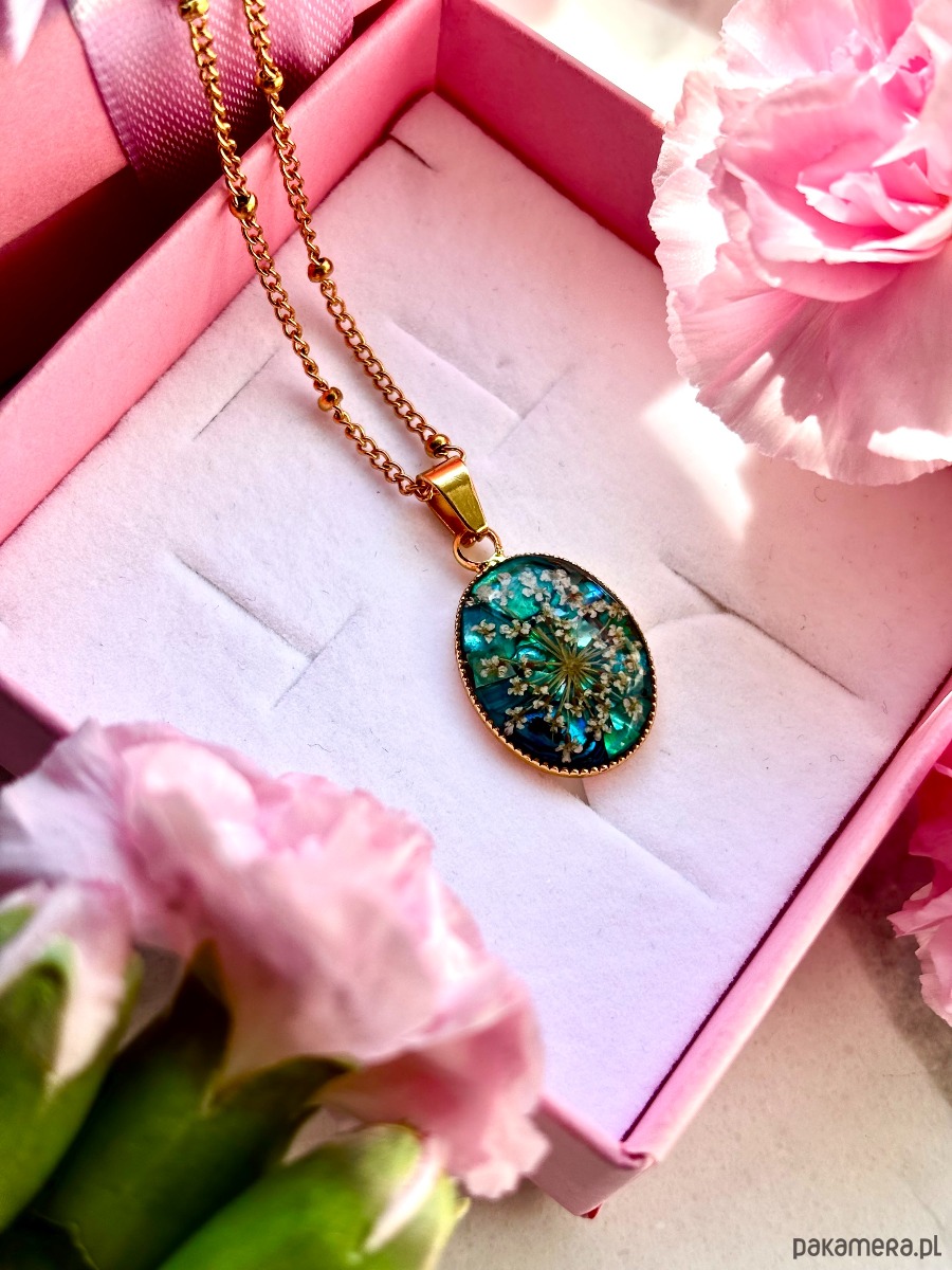W owalnej oprawie o wymiarach 20 mm x 14 mm zostały zatopione starannie wyselekcjonowane, ręcznie suszone kwiaty dzikiej marchwi. Każdy z płatków zachował swoją unikalną formę, dzięki czemu kompozycja przypomina miniaturową, kwitnącą łąkę zatrzymaną w czasie.