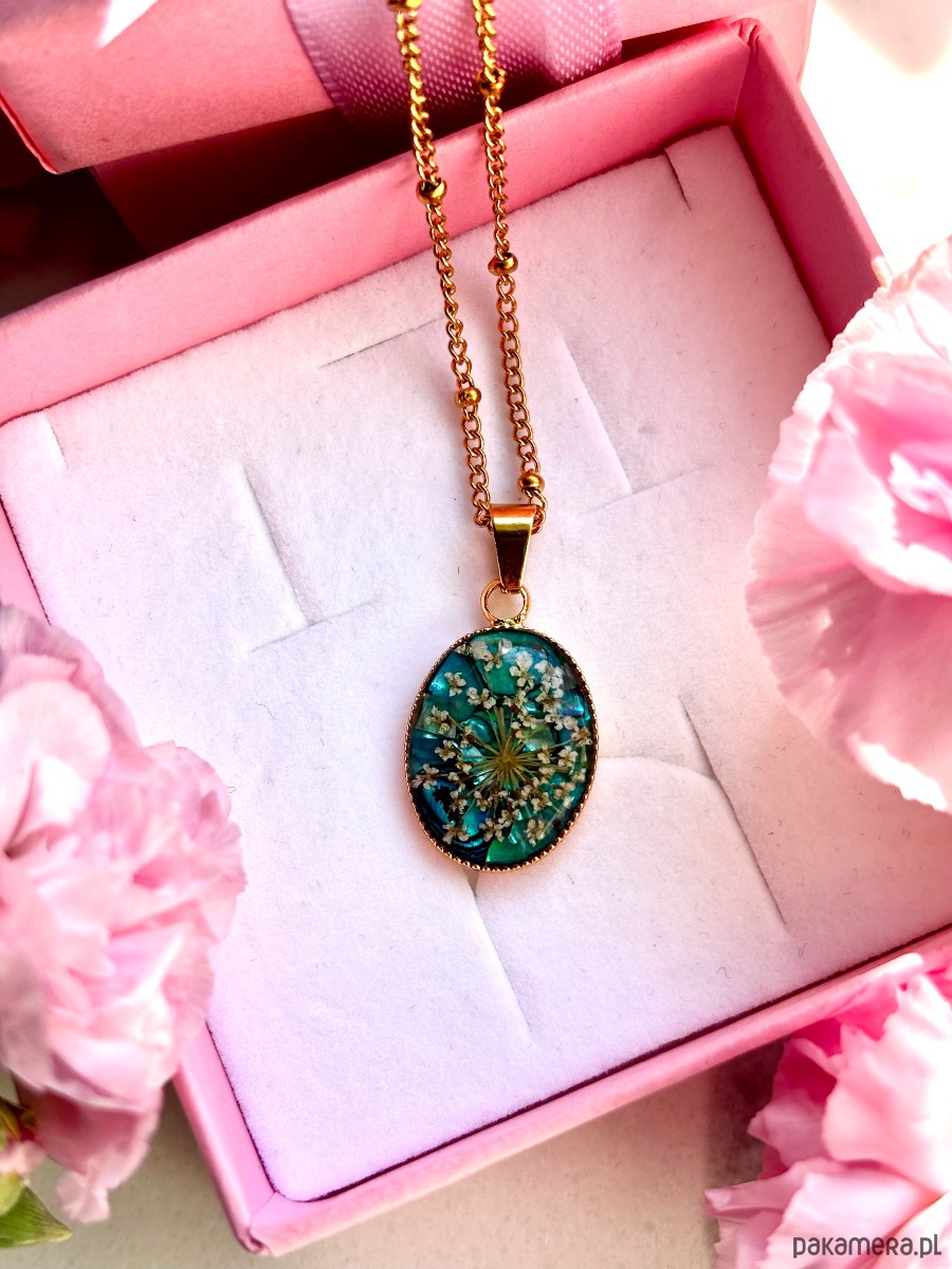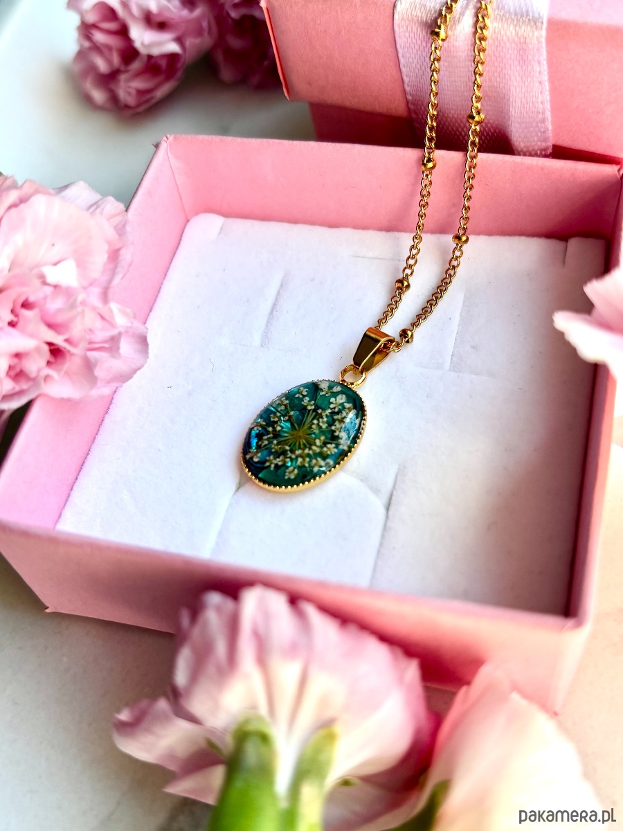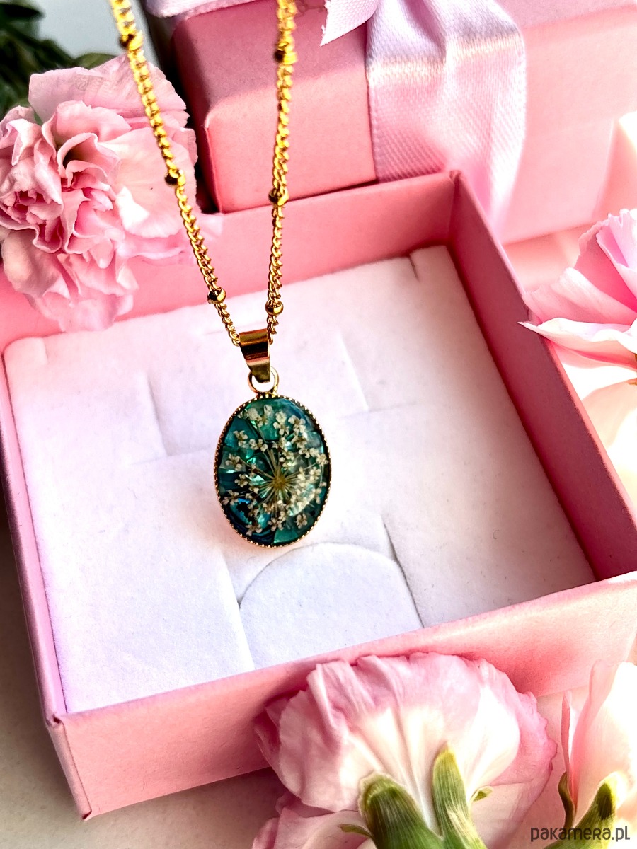 W owalnej oprawie o wymiarach 20 mm x 14 mm zostały zatopione starannie wyselekcjonowane, ręcznie suszone kwiaty dzikiej marchwi. Każdy z płatków zachował swoją unikalną formę, dzięki czemu kompozycja przypomina miniaturową, kwitnącą łąkę zatrzymaną w czasie.