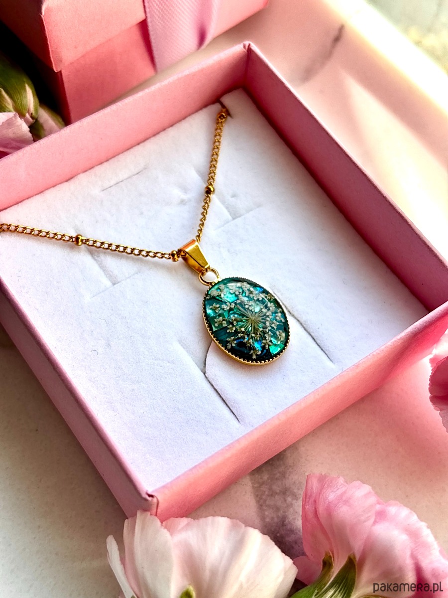 Materiał: stal nierdzewna w kolorze złotym, żywica epoksydowa, suszone kwiaty, masa perłowa.