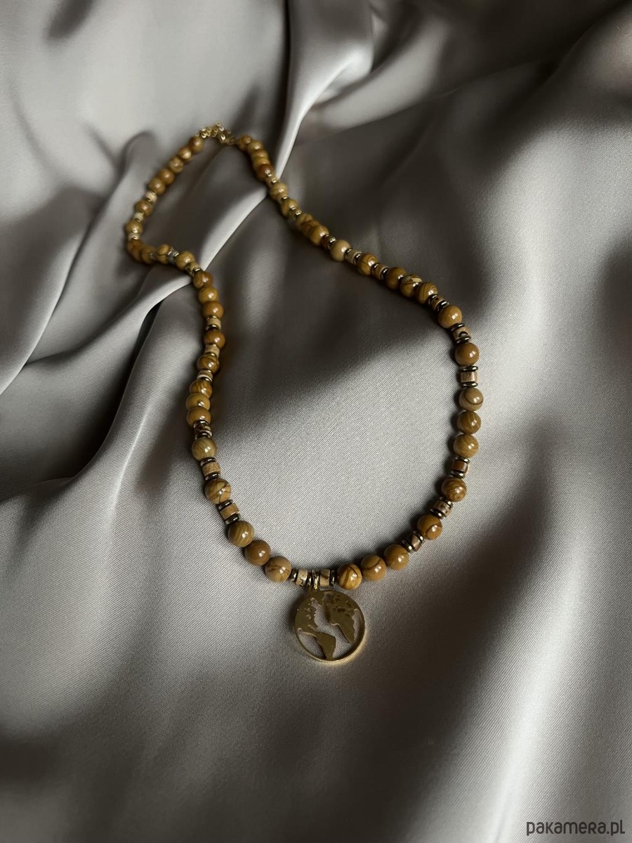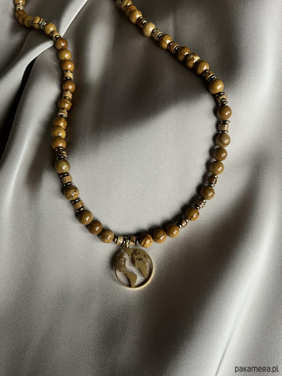 Ręcznie wykonany naszyjnik z jaspisu krajobrazowego 6 mm, uzupełniona subtelnymi hematytami, tworzy harmonijną kompozycję inspirowaną kolorami ziemi.