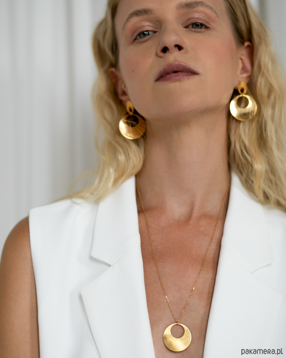 Minimalistyczny, ale jednocześnie efektowny naszyjnik ozdobiony dużym kołem. Klasyczny wzór, który sprawdzi się doskonale do codziennych stylizacji, jak również na specjalne okazje. Przy zapięciu metka z logo marki.