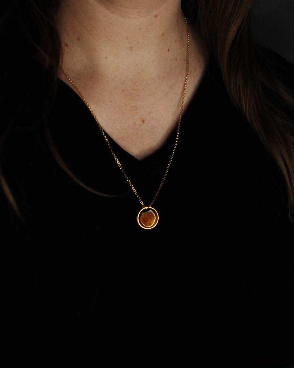 Naturalny bursztyn w minimalistycznej oprawie ze srebra próby 925 w szczotkowanym wykończeniu z jednej strony i polerowanym z drugiej. Pokryty żłotym złoceniem o grubośc 2mikronów oraz zabezpieczona nanonopowłoką.