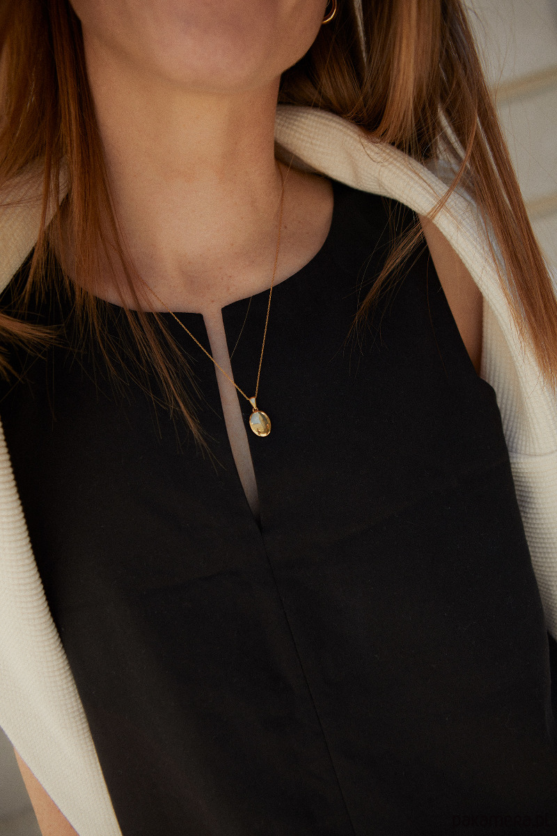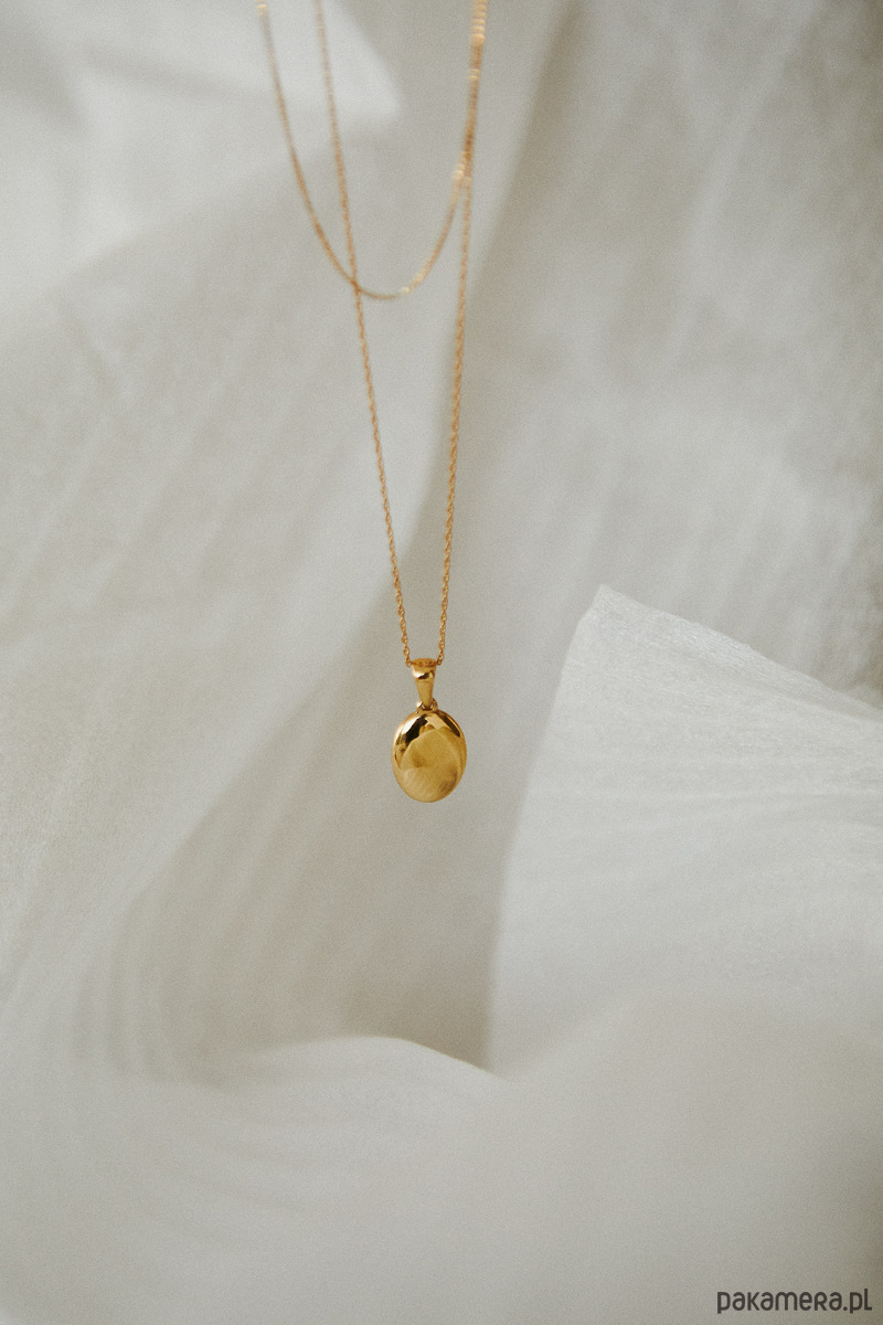 Ten wypukły medalik doda odrobinę blasku codziennym momentom, pięknie odbijając światło i kolory, które Cię otaczają. Został zawieszony na ozdobnym, delikatnym łańcuszku, który kontrastuje z prostą formą wisiorka, dopełniając całość.
