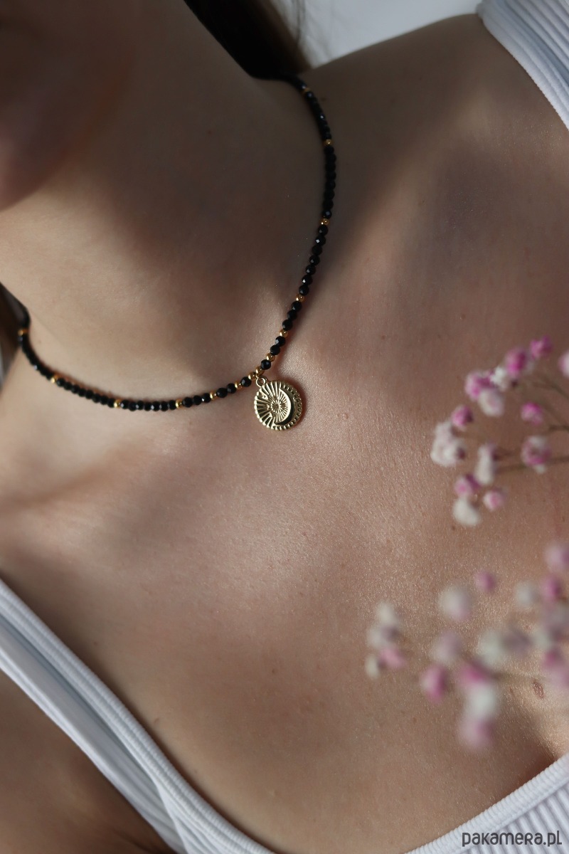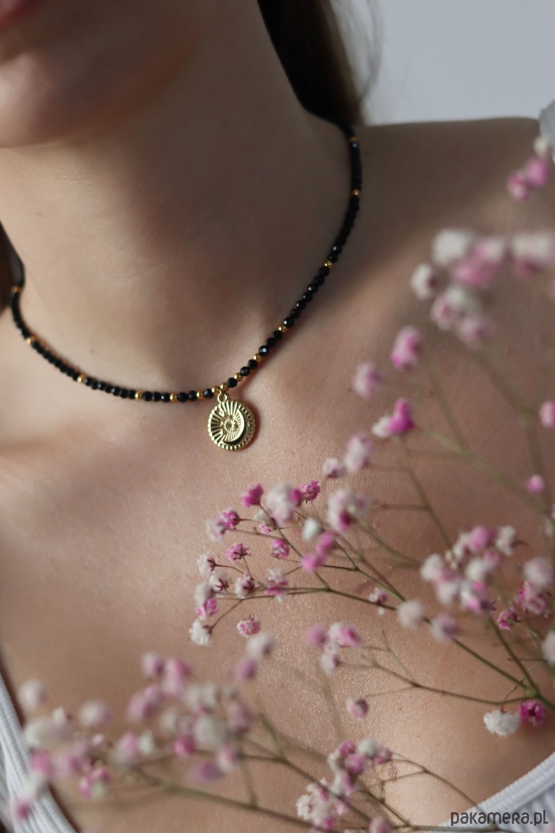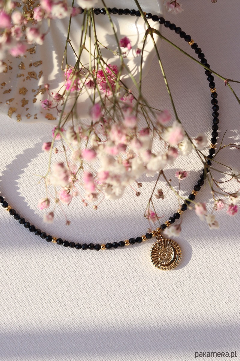Wyjątkowy naszyjnik, który łączy w sobie piękno naturalnych kamieni z eleganckimi detalami. Wykonany z fasetowanego czarnego turmalinu, którego delikatne szlify odbijają światło, dodając blasku każdej stylizacji. Złocone przekładki subtelnie podkreślają głęboką czerń turmalinu, nadając naszyjnikowi wyjątkowego charakteru.