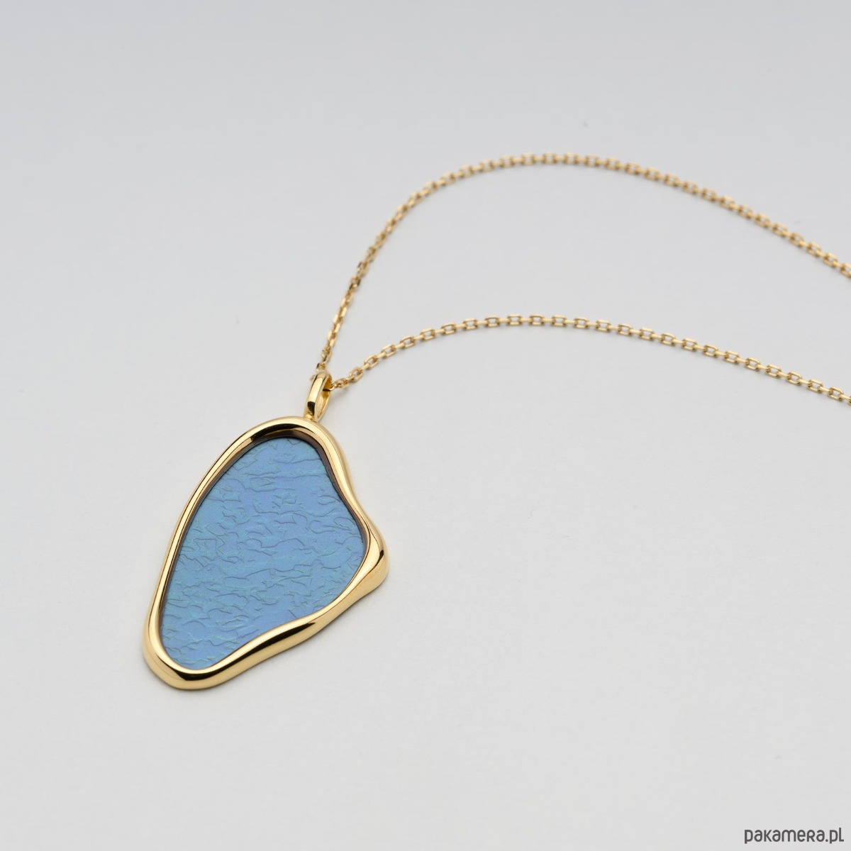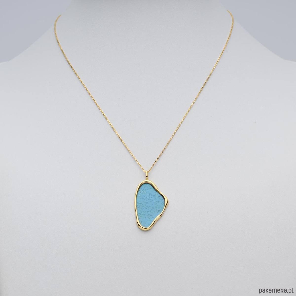 Głównym elementem jest zawieszka w kształcie pięknej nieregularnej podłużnej formy. Jej unikalny wygląd to zasługa połączenia dwóch materiałów: srebra 925 i turkusowego tytanu.