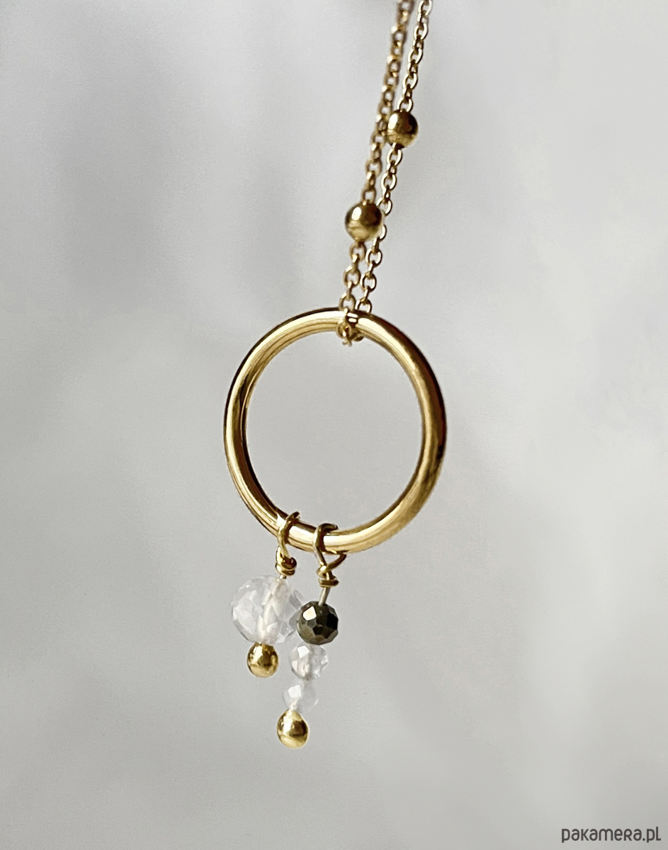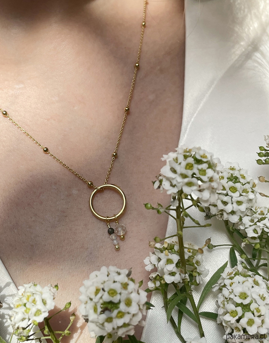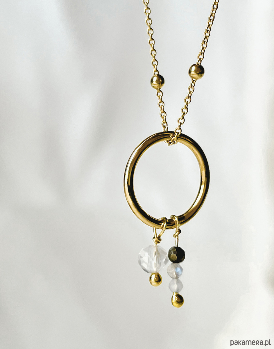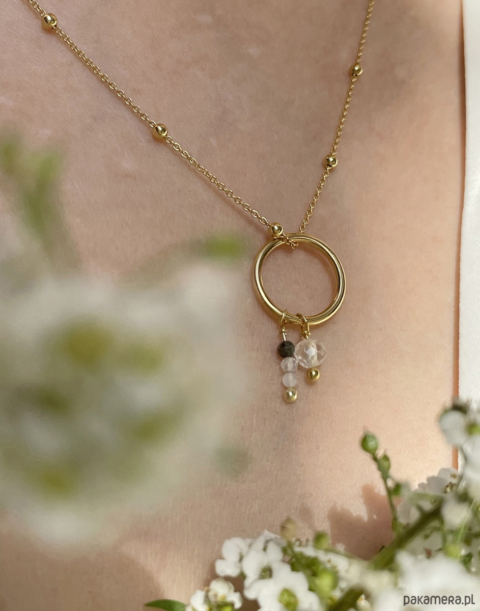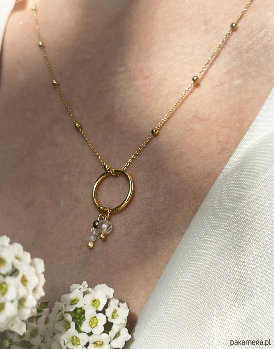 Każda zawieszka złożona jest z trzech kamieni zawieszonych na kółku. Naszyjnik został wykonany ze srebra próby 925, pozłacanego 24-karatowym złotem. Do wyboru przygotowaliśmy dwie długości delikatnego łańcuszka z kulkami.