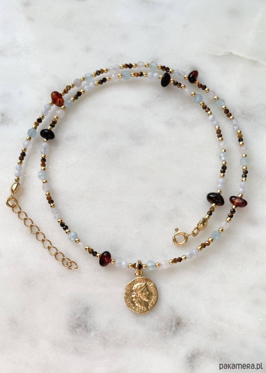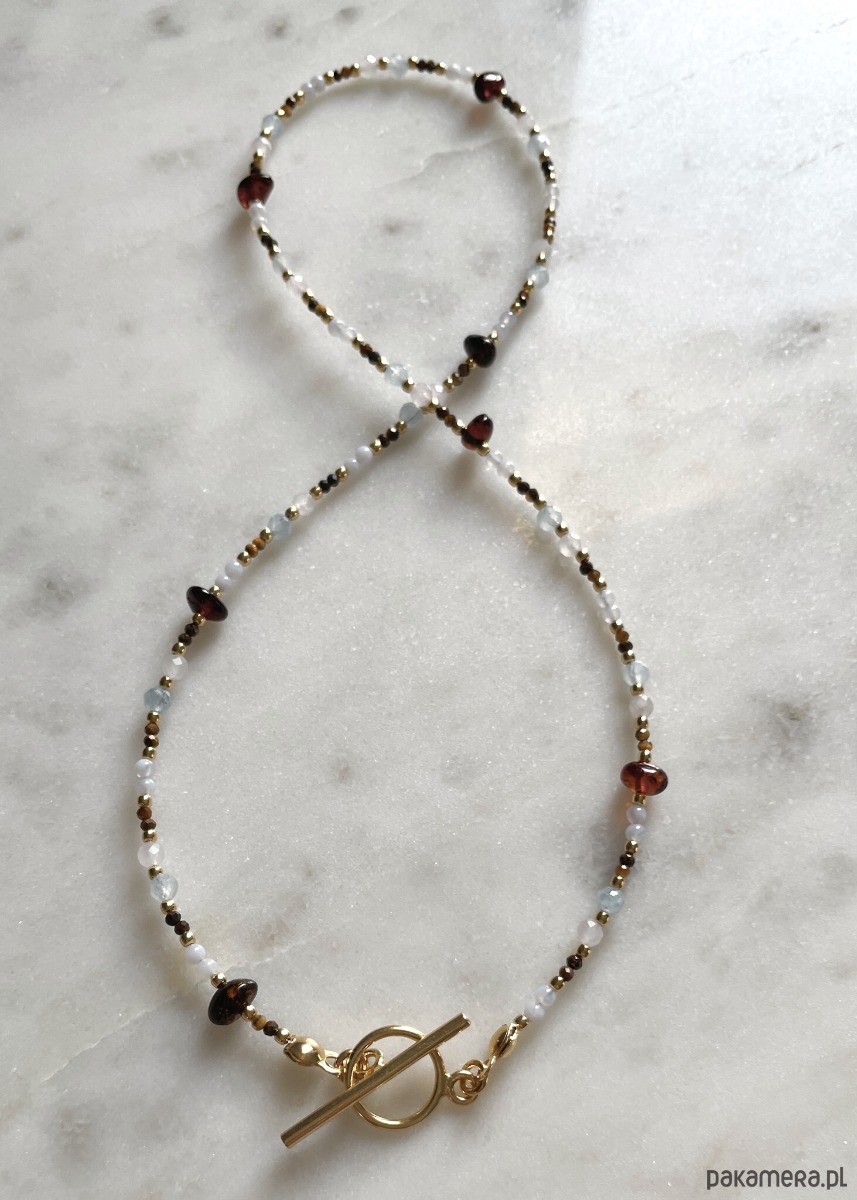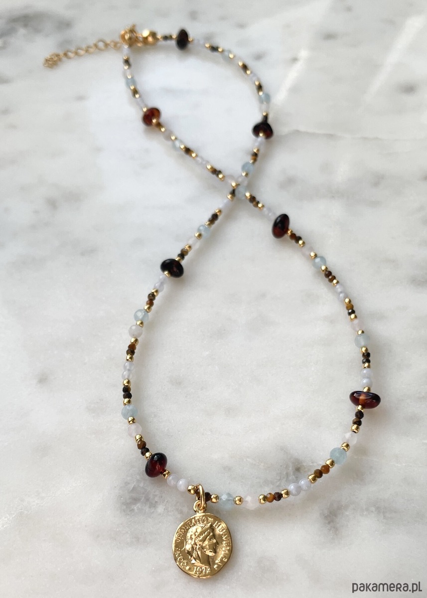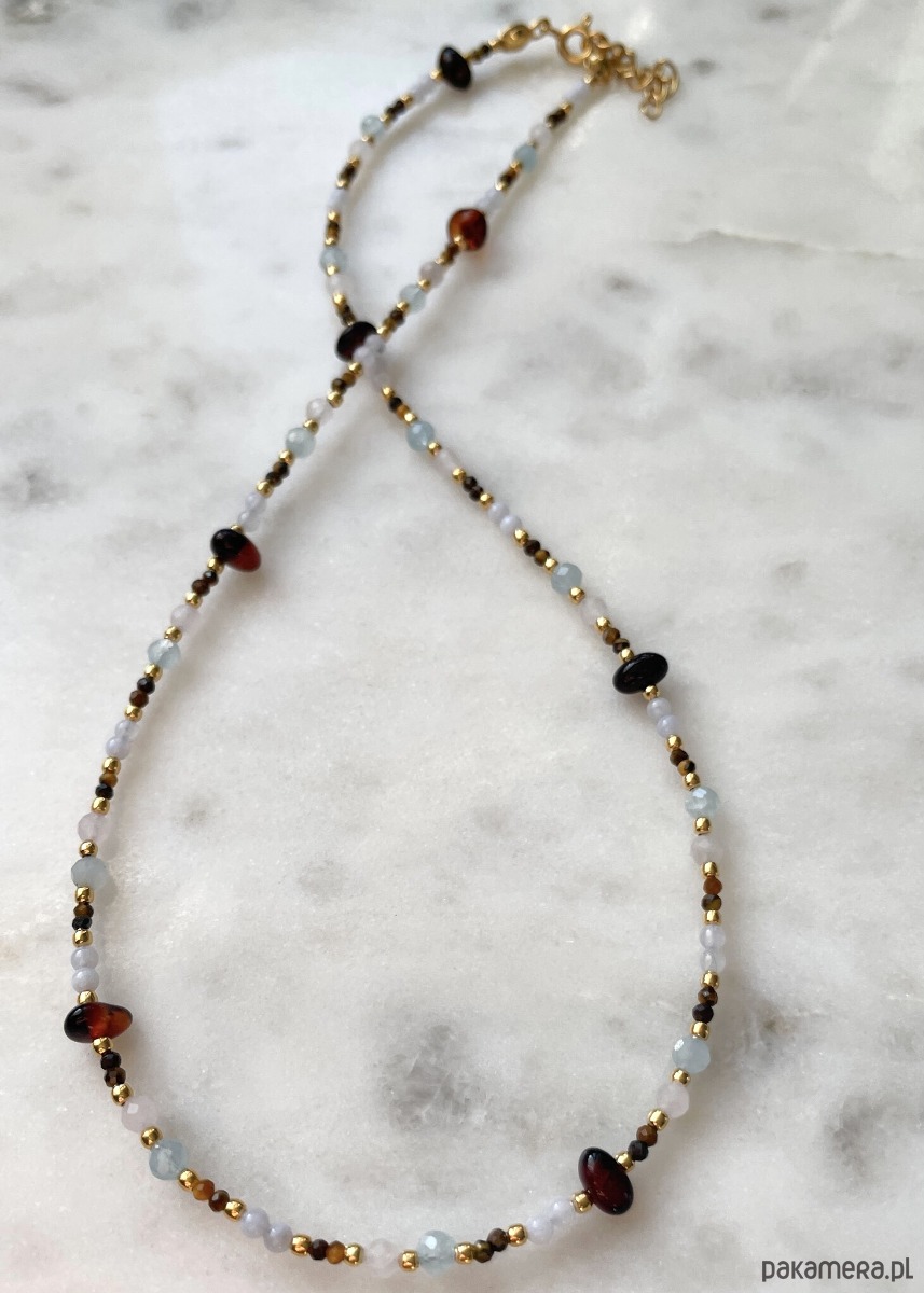 Naszyjnik z kamieniami naturalnymi, przekładana pozłacanymi kulkami ze srebra próby 925. Są to kamienie odpowiednie znaku zodiaku Bliźnięta.