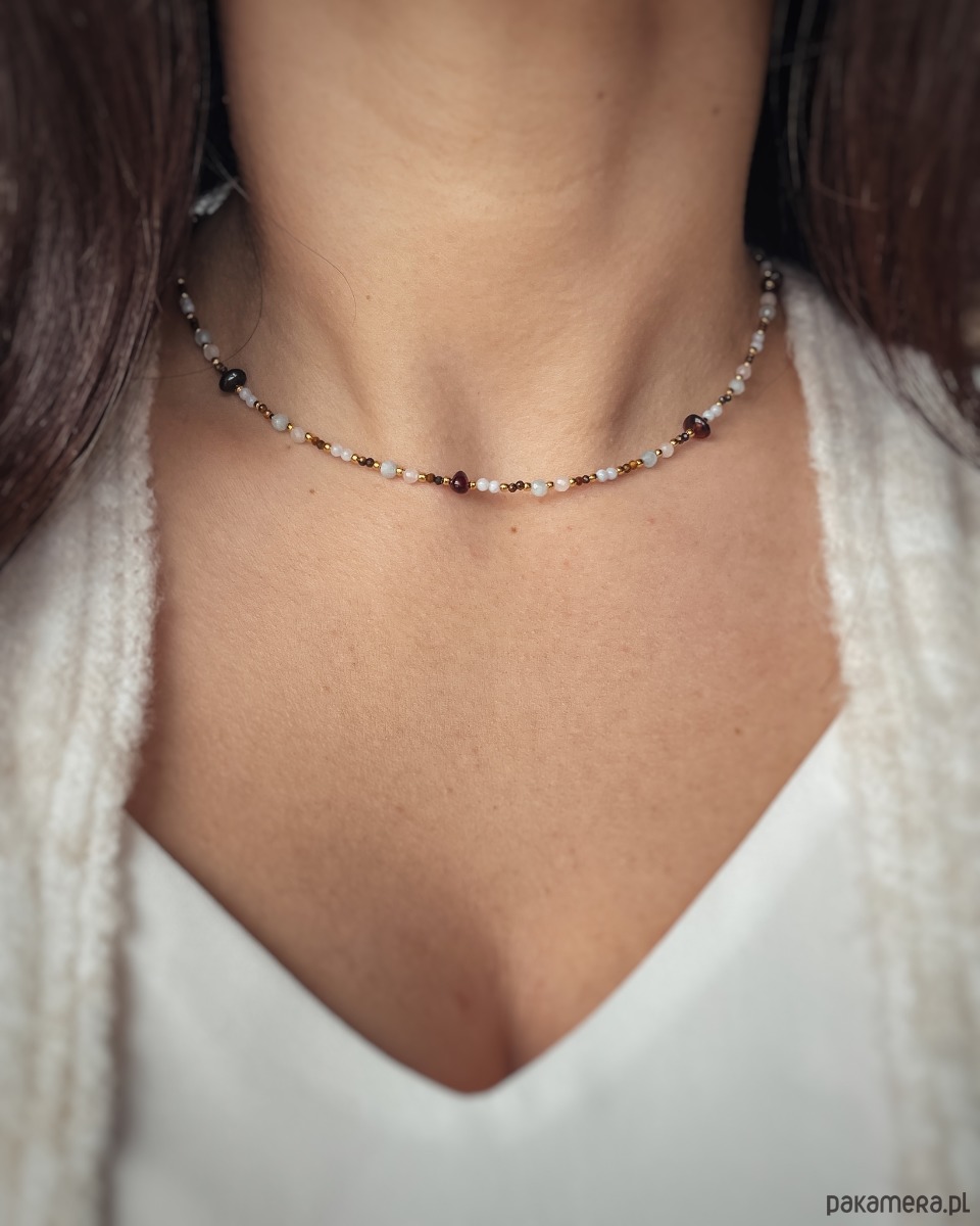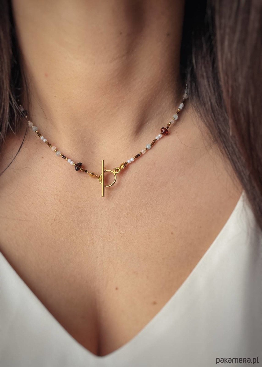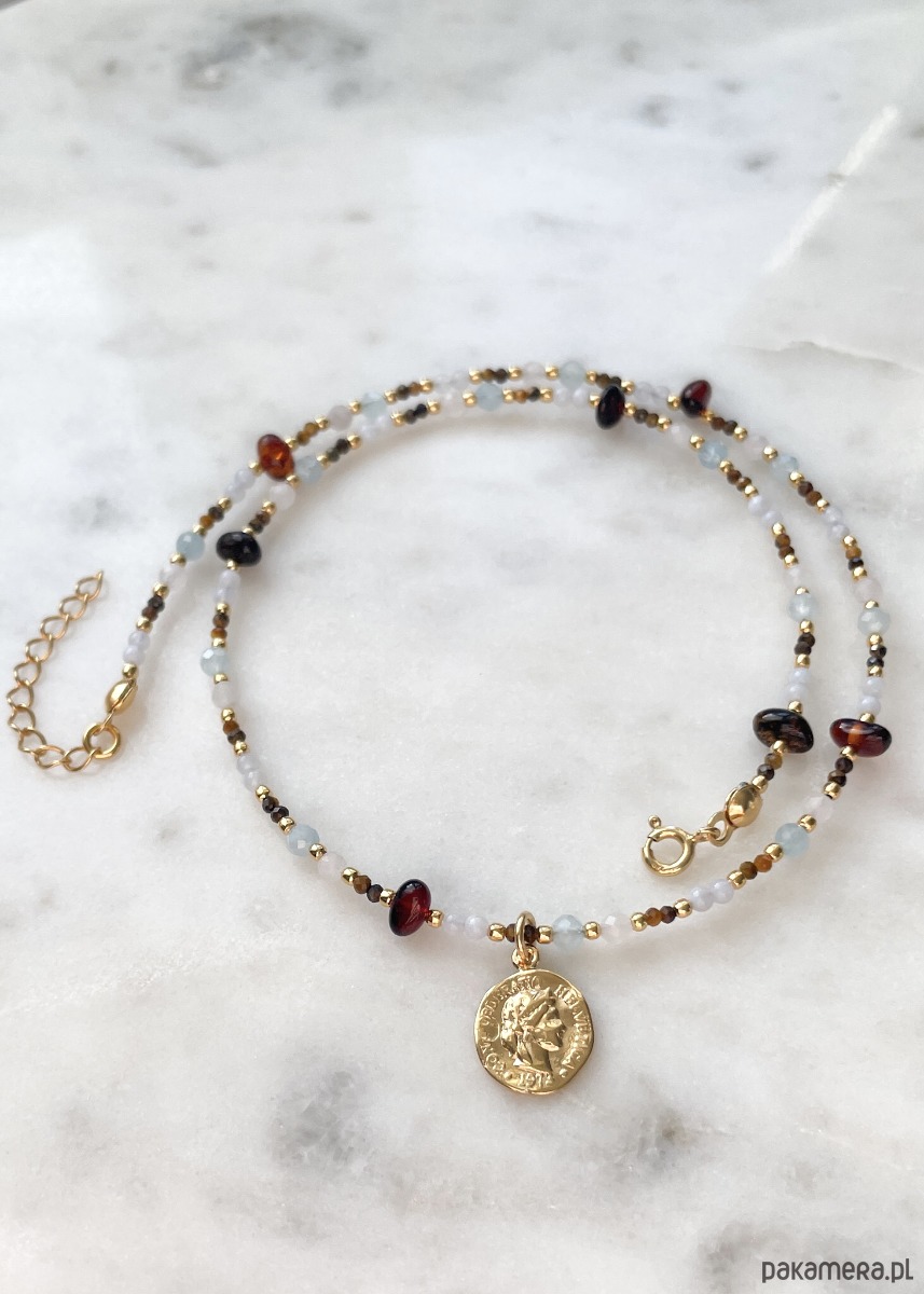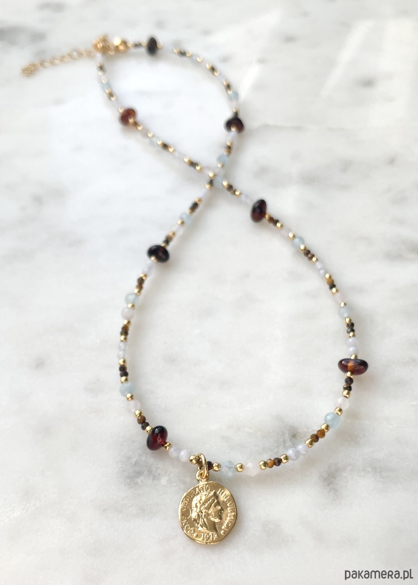 Naszyjnik z kamieniami naturalnymi, przekładana pozłacanymi kulkami ze srebra próby 925. Są to kamienie odpowiednie znaku zodiaku Bliźnięta.