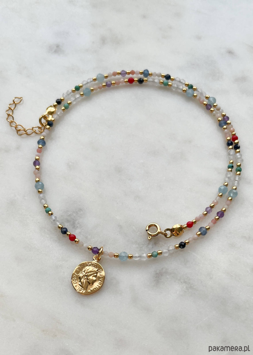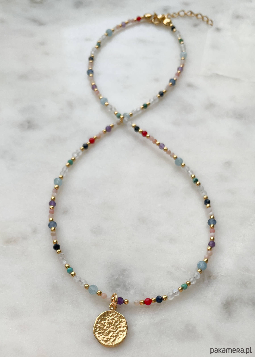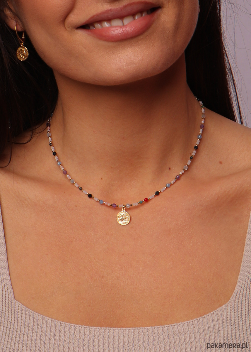 Naszyjnik wykonany z kamieni naturalnych i pozłacanych kulek ze srebra próby 925. Są to kamienie odpowiednie znaku zodiaku Ryby.