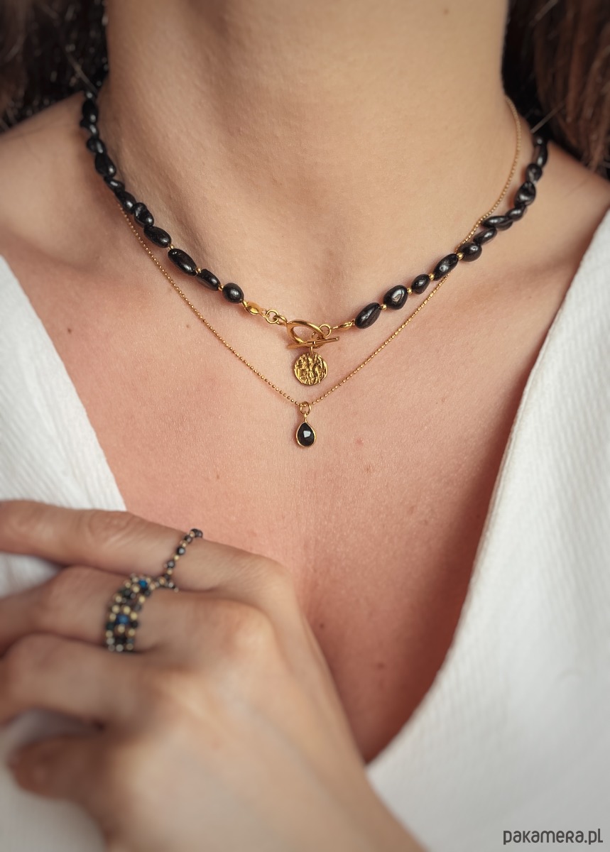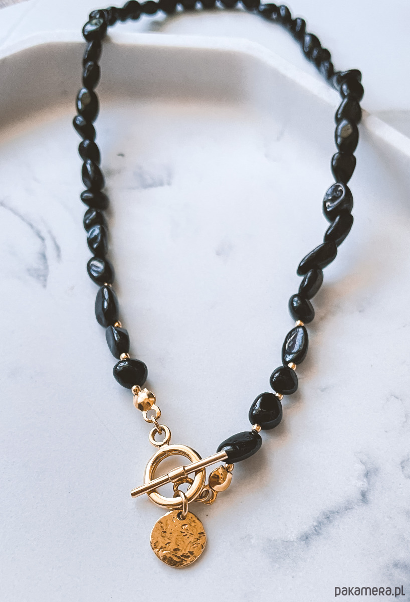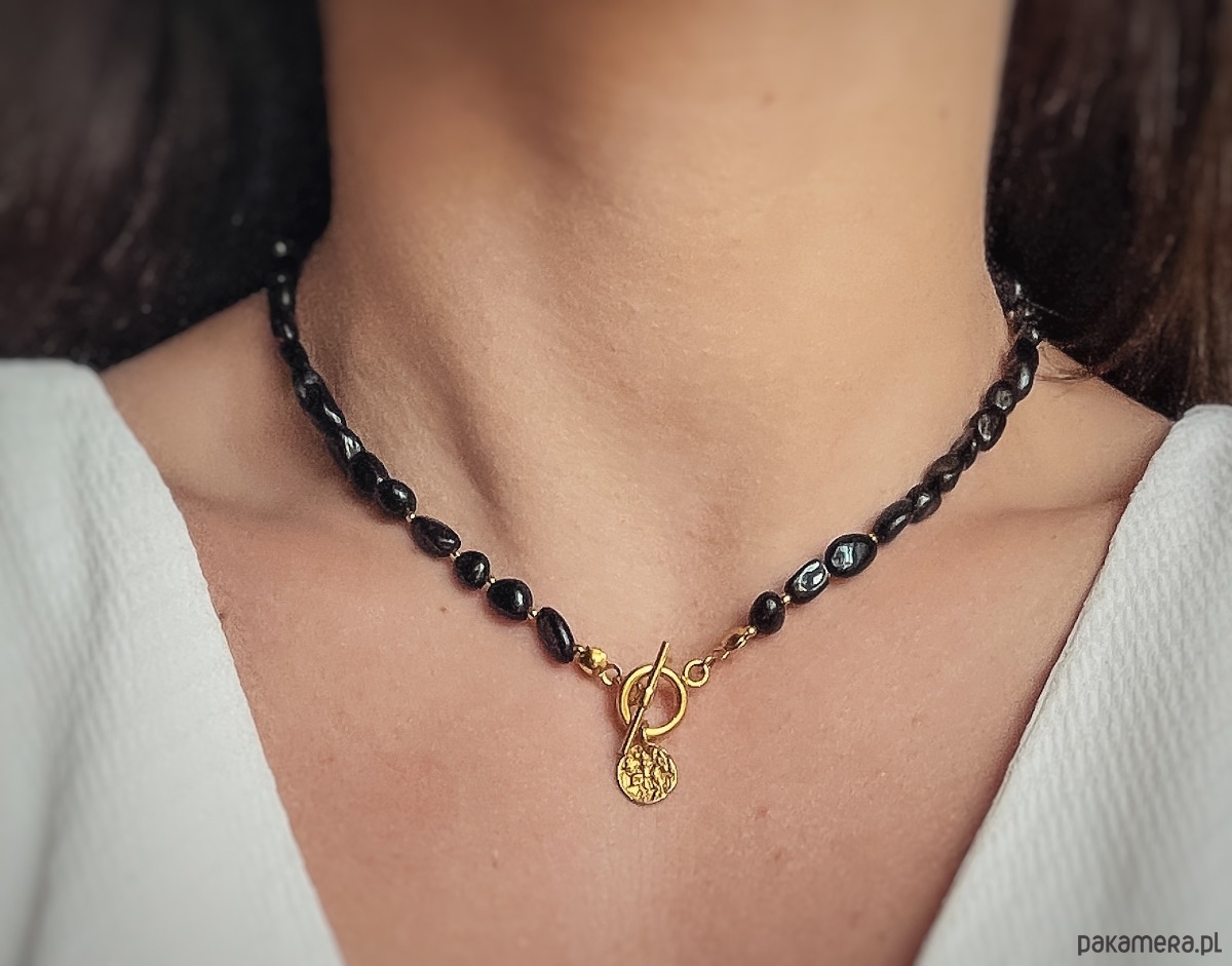 Naszyjnik w głębokim, klasycznym kolorze, wykonany z przepięknych, czarnych turmalinów. Jest on wykończony pozłacanymi elementami ze srebra próby 925. Zapięcie toggle prezentuje się zjawiskowo, dodaje charakteru naszyjnikowi. Jego zdecydowanym atutem jest to, że poprzez jego uniwersalny kolor możmy ubrać go do każdej stulizacji.