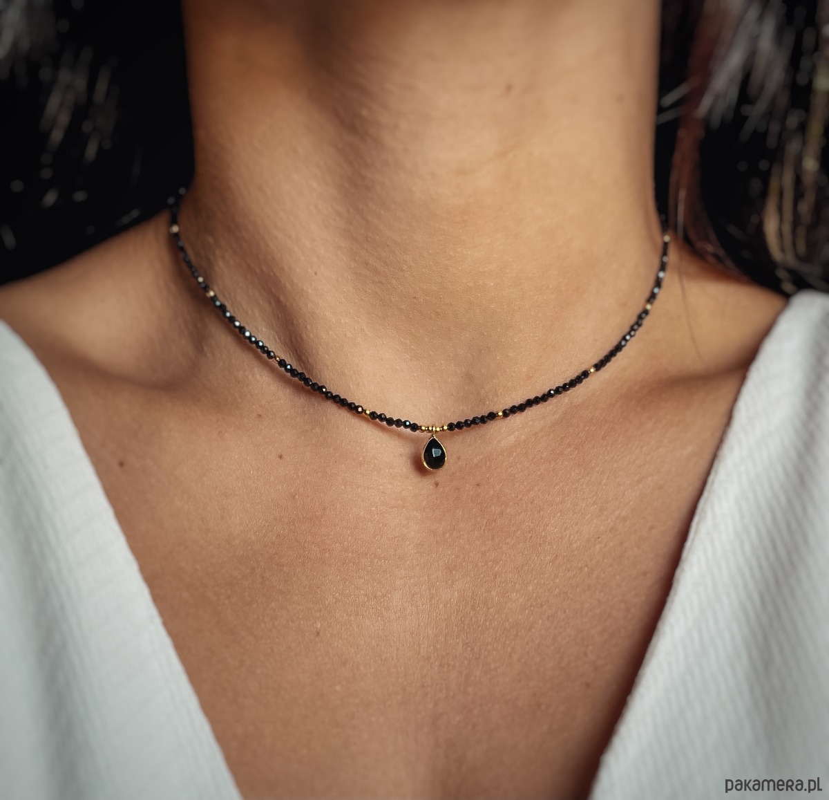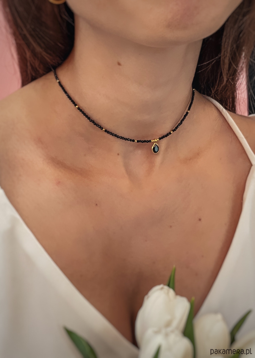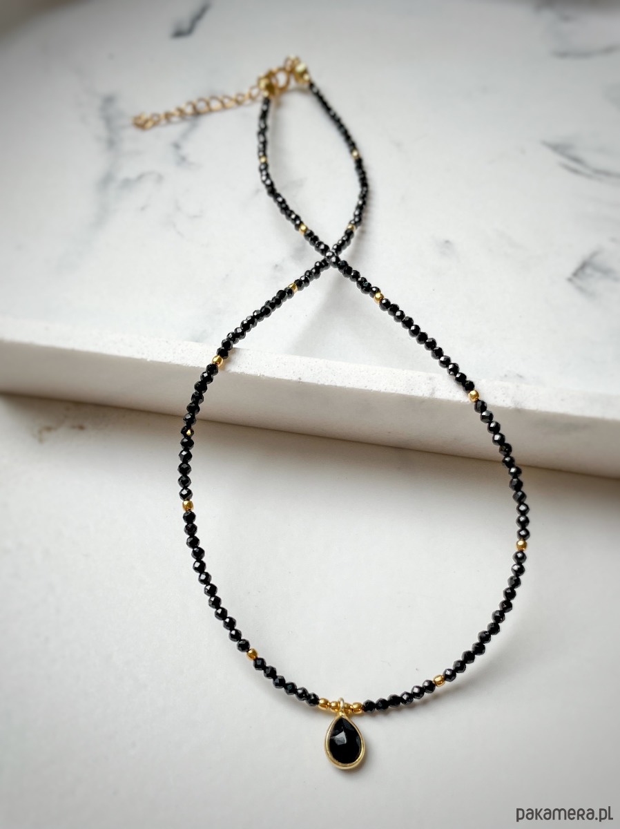 Zjawiskowy naszyjnik w przepięknym kolorze wykonany własnoręcznie z czarnych spineli. Posiada on również zawieszkę - onyks w okuciu. Całość wykończona jest pozłacanym srebrem próby 925. Naszyjnik cudownie prezentuje się na szyi, jest to kolor który skradnie serce niejednej osobie! Jest niesamowicie uniwersalny, można go skomponować z inną biżuterią jak i z wieloma różnymi stylizacjami! Będzie to również odpowiedni pomysł na prezent..