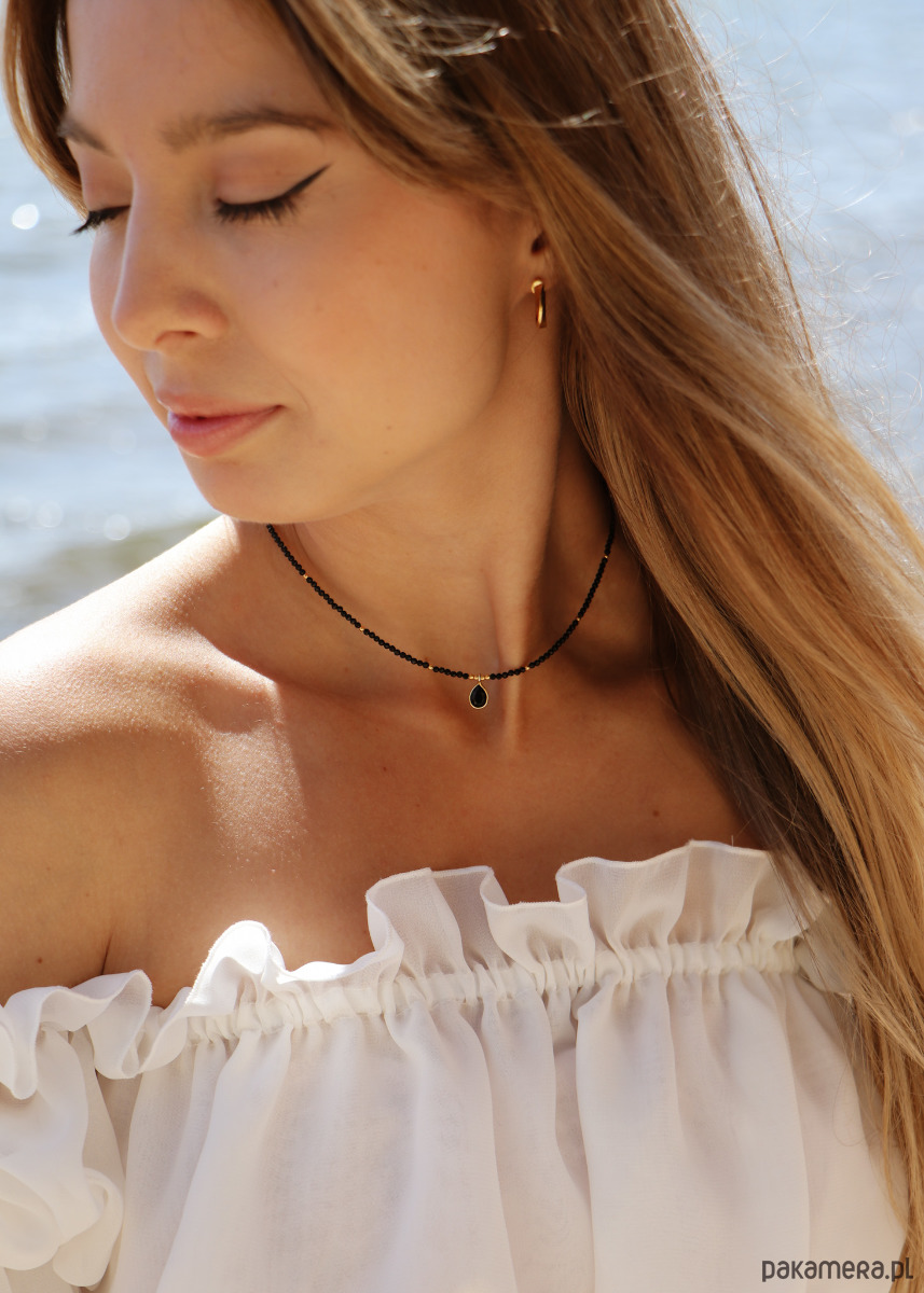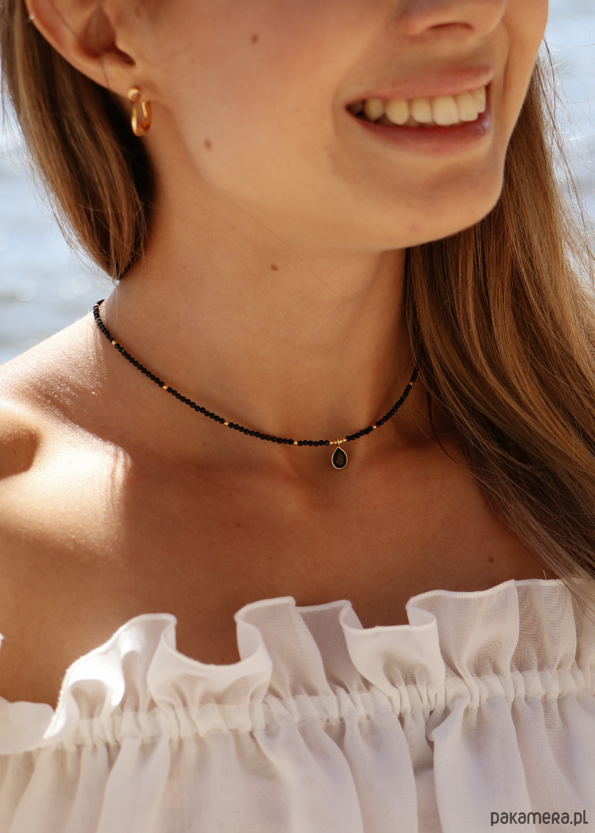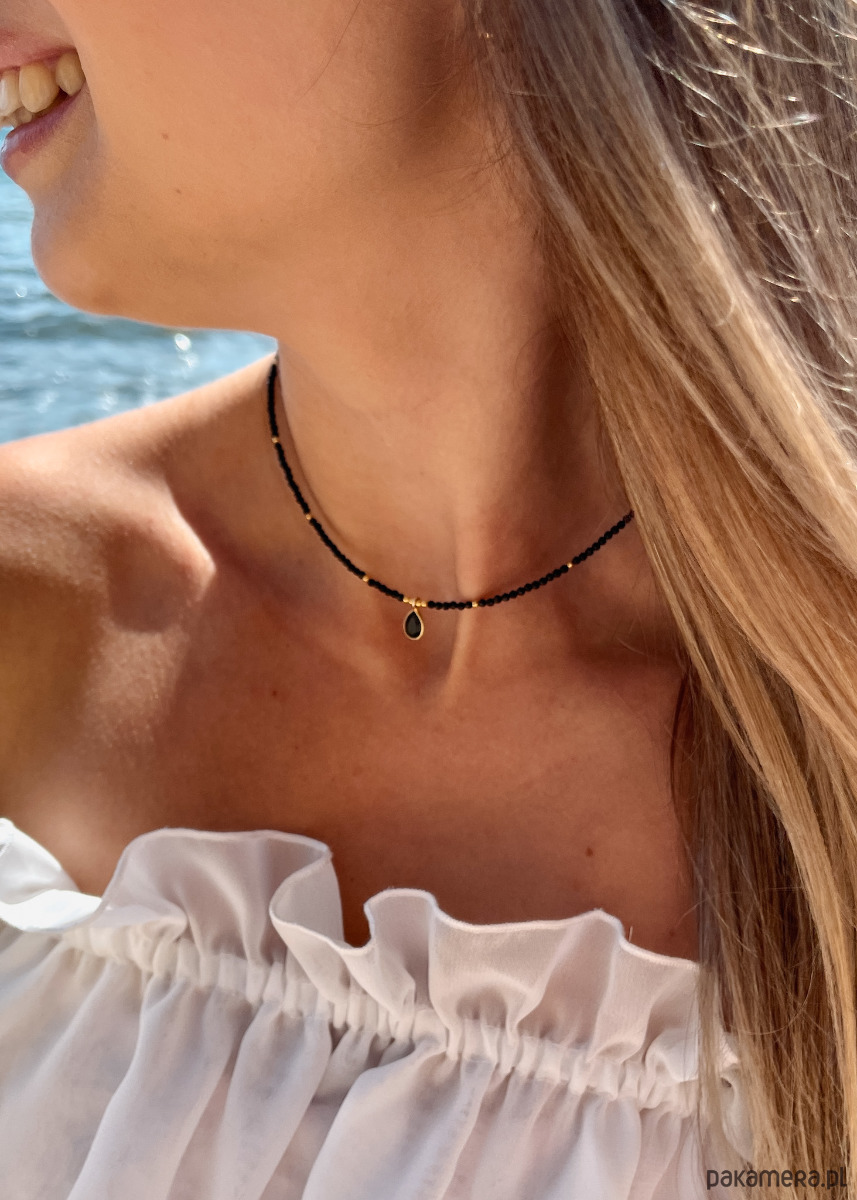 Zjawiskowy naszyjnik w przepięknym kolorze wykonany własnoręcznie z czarnych spineli. Posiada on również zawieszkę - onyks w okuciu. Całość wykończona jest pozłacanym srebrem próby 925. Naszyjnik cudownie prezentuje się na szyi, jest to kolor który skradnie serce niejednej osobie! Jest niesamowicie uniwersalny, można go skomponować z inną biżuterią jak i z wieloma różnymi stylizacjami! Będzie to również odpowiedni pomysł na prezent..