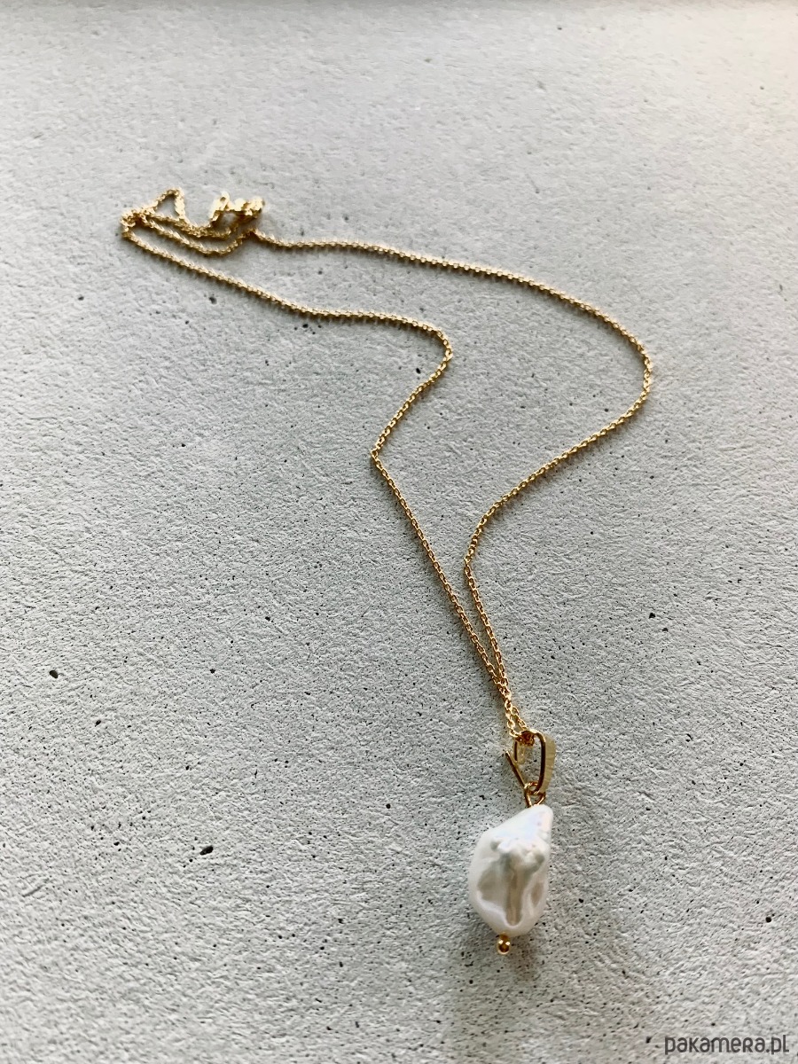 Naszyjnik z nieregularną perłą hodowlaną. Całość wykonana ze srebra próby 925, złocone 24-karatowym złotem. Biżuterię wykonujemy ręcznie, dlatego wielkość, kształt oraz kolor pereł może nieznacznie różnić się od tego na zdjęciu.
