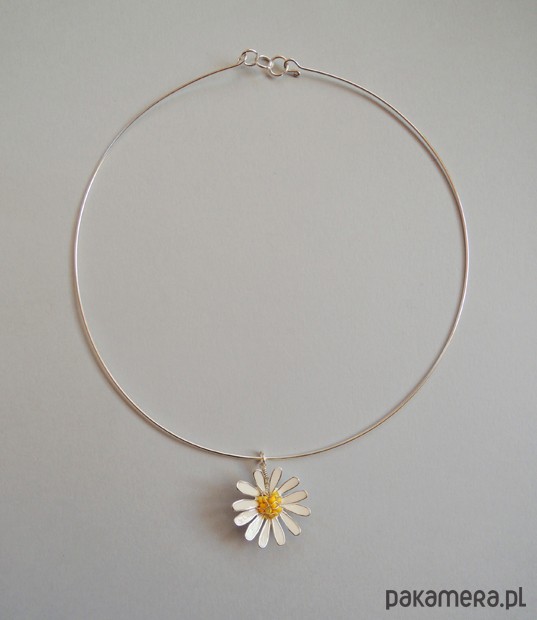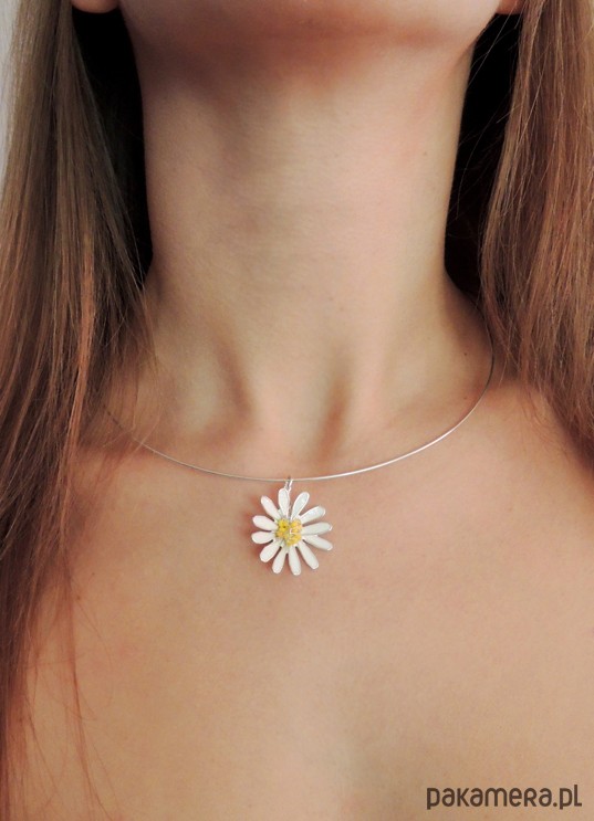 Unikatowa zawieszka stokrotka na cienkiej obróżce, wykonana od podstaw ręcznie autorską techniką łączoną z wire-wrapping.