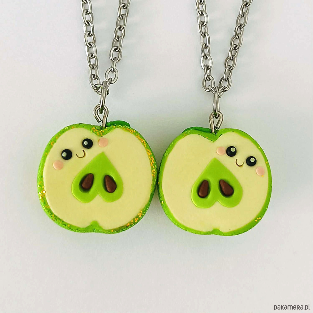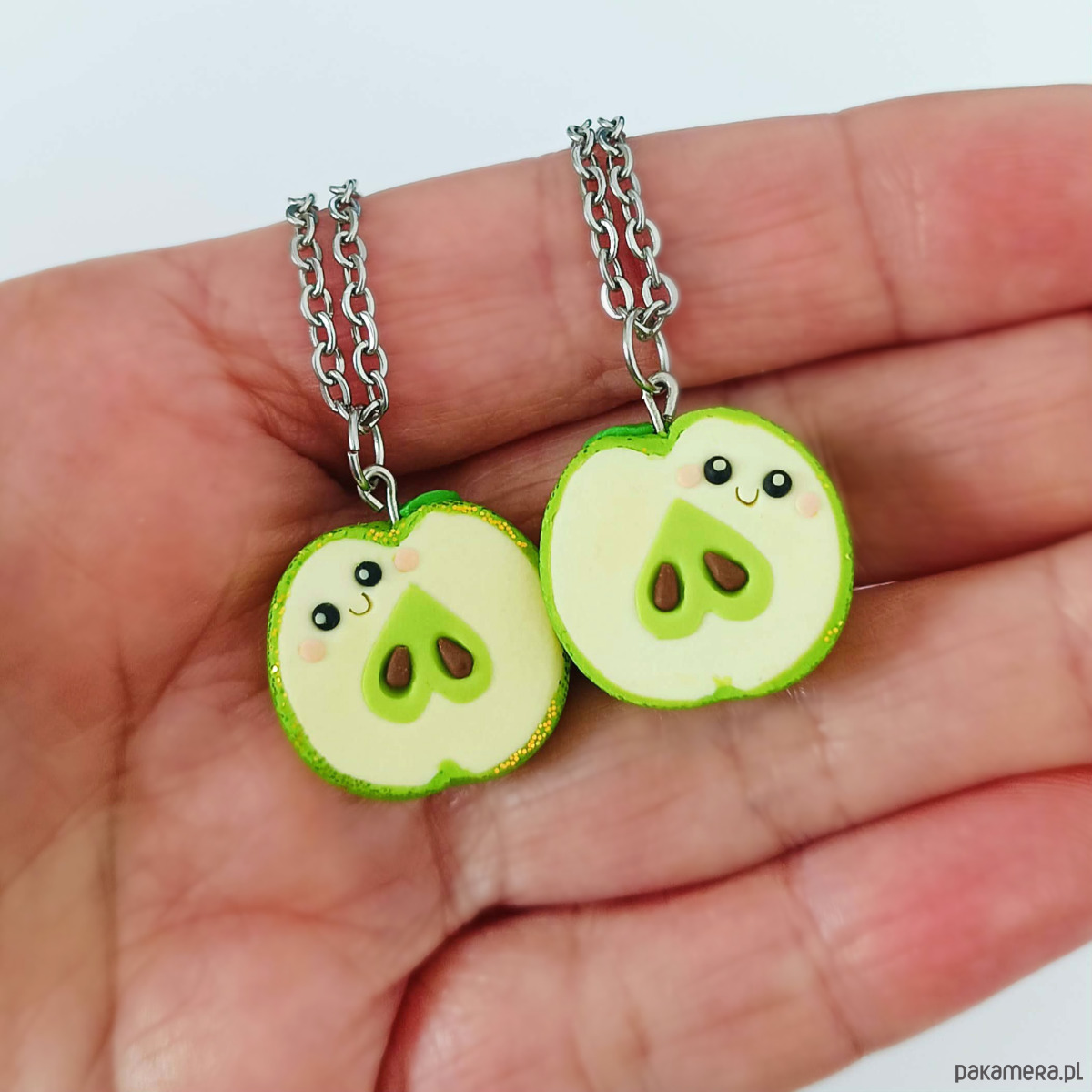 Każdy naszyjnik przedstawia jedną połówkę jabłka – razem tworzą całość, co czyni je pięknym symbolem przyjaźni, bliskości i miłości.