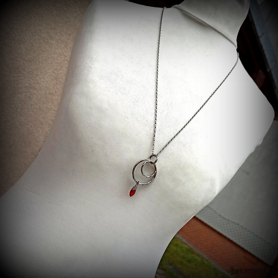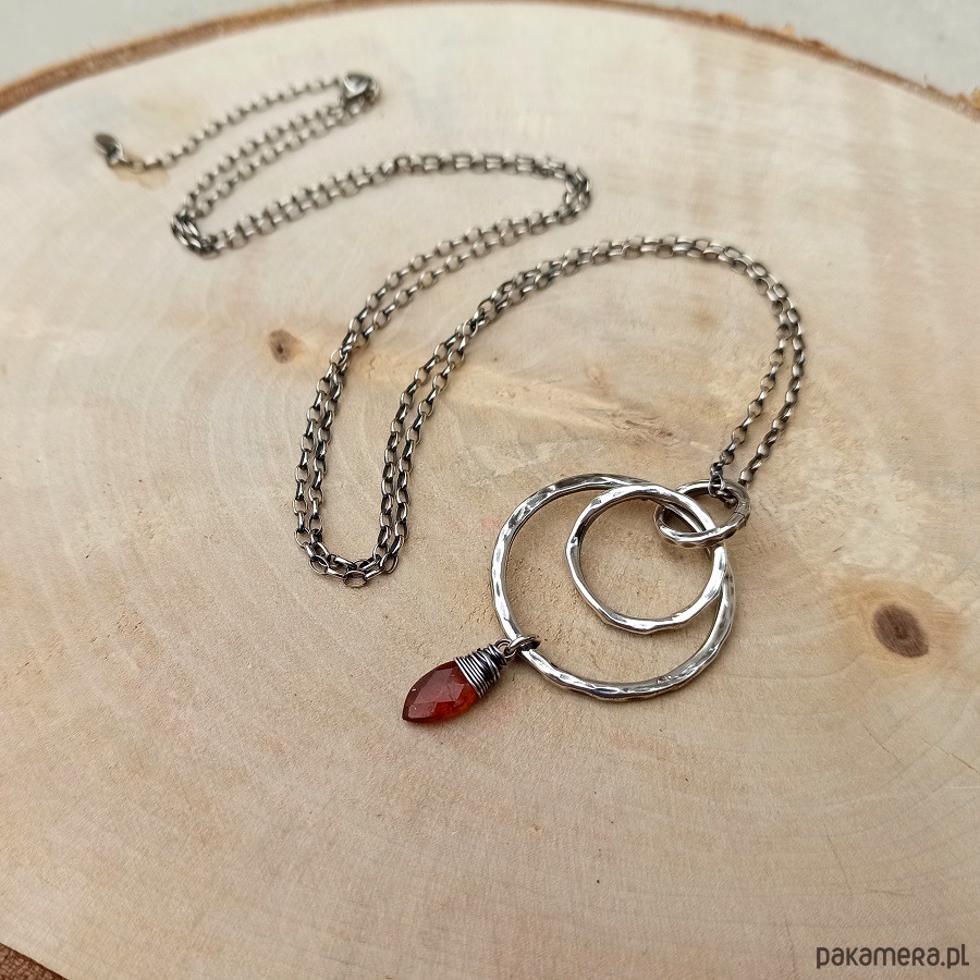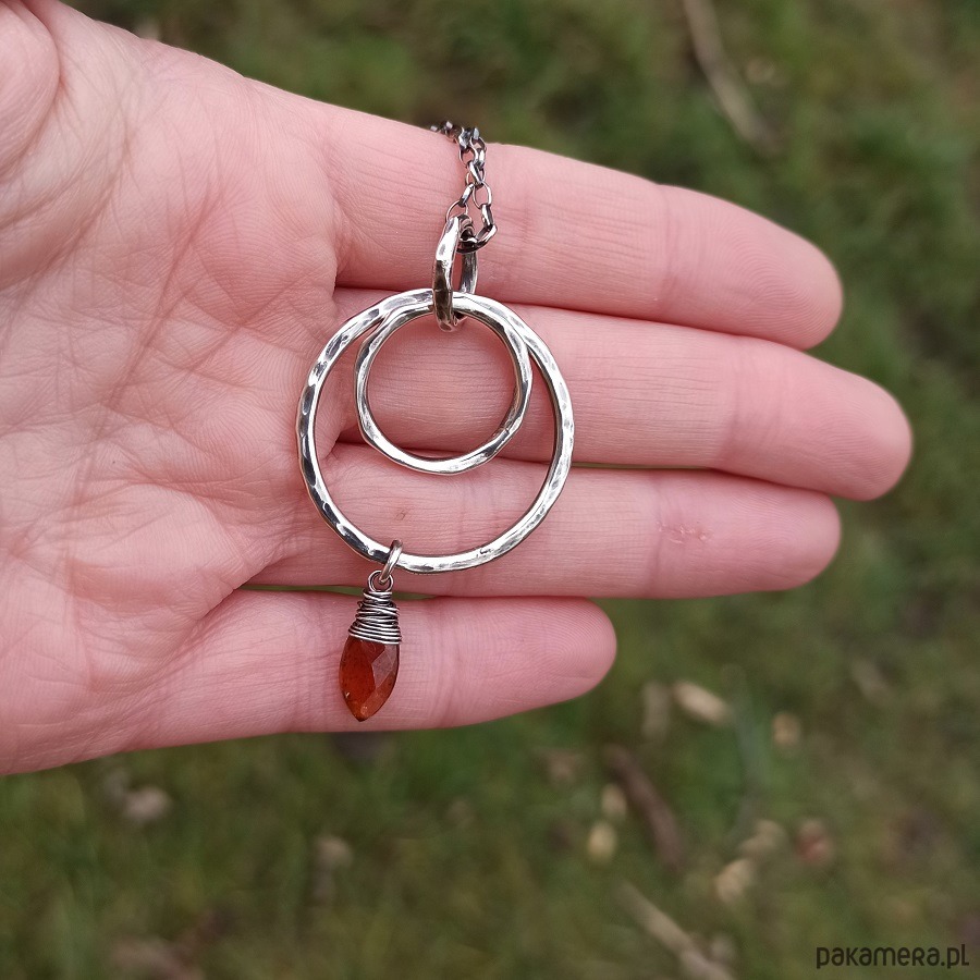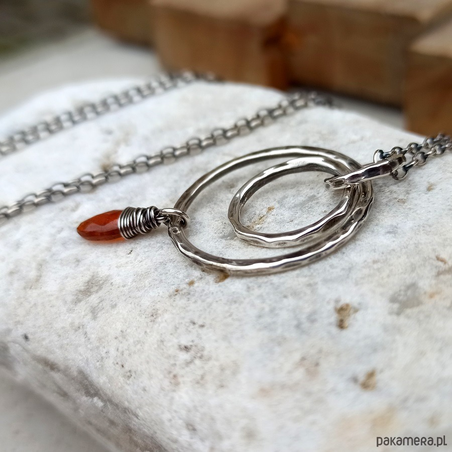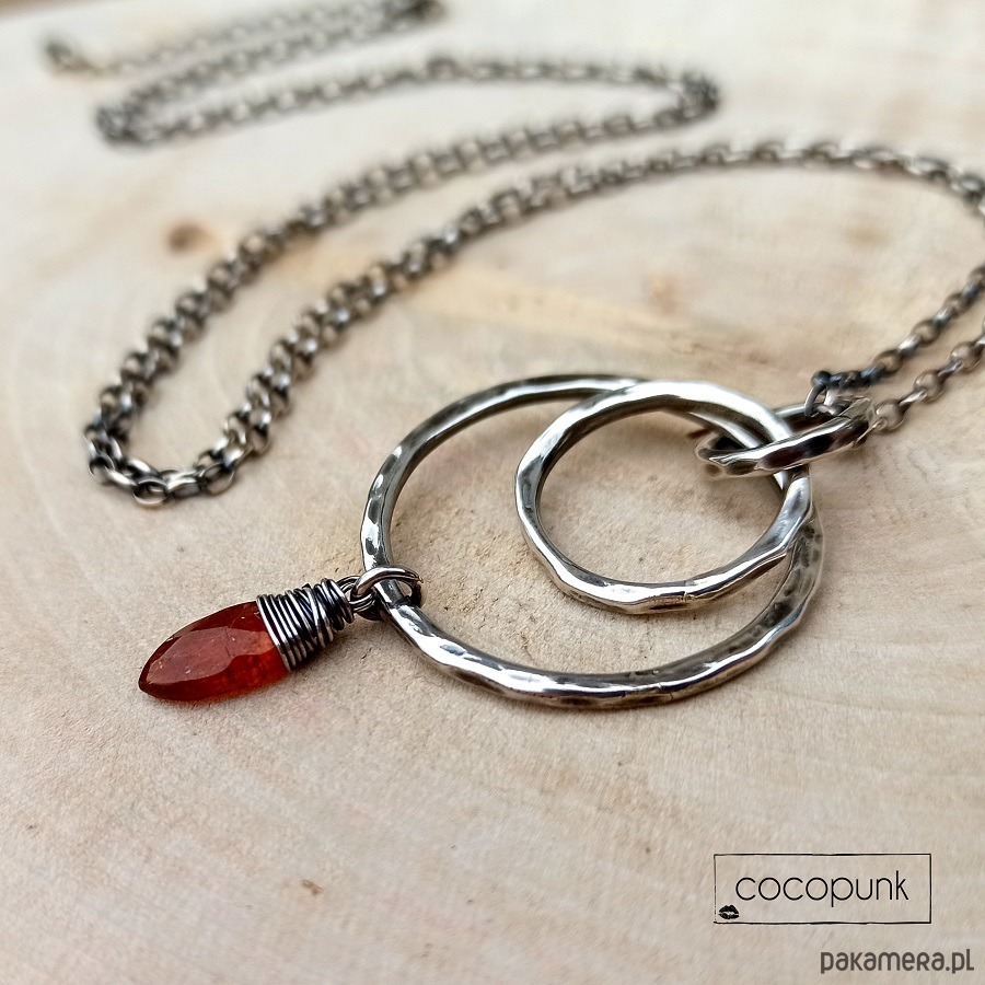 Długi, nowoczesny naszyjnik wykonany w całości ze srebra pr. 925 ( przyciemnianego i polerowanego). Ręcznie kute, młotkowane kółka maja wielkość 1,2-3 cm. Dodatkowo zdobi go markiza kianitu w przepięknym i niespotykanym ciemno pomarańczowym kolorze- ok. 1cm. Długość całkowita zawieszki- 4,5cm. Długość łańcuszka- 70cm plus 5cm regulacji. Kianit to kamień naturalny- każda sztuka jest jedyna i niepowtarzalna. W galerii mojej znajdą Państwo kolczyki i bransoletę do kompletu. Biżuteria dotrze elegancko zapakowana.