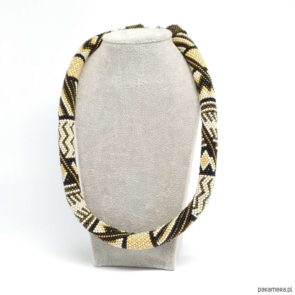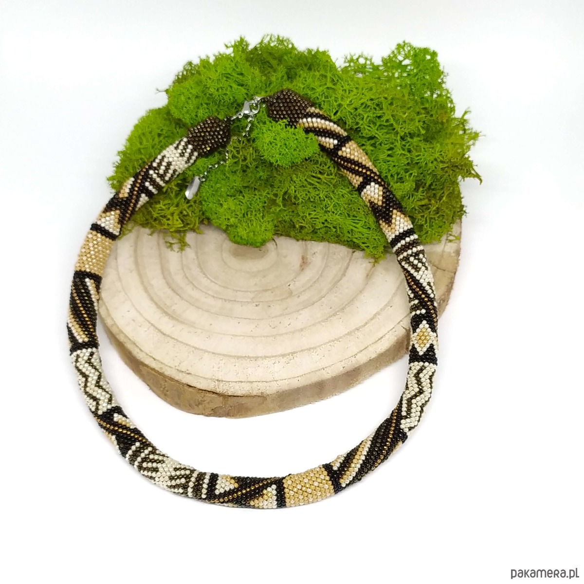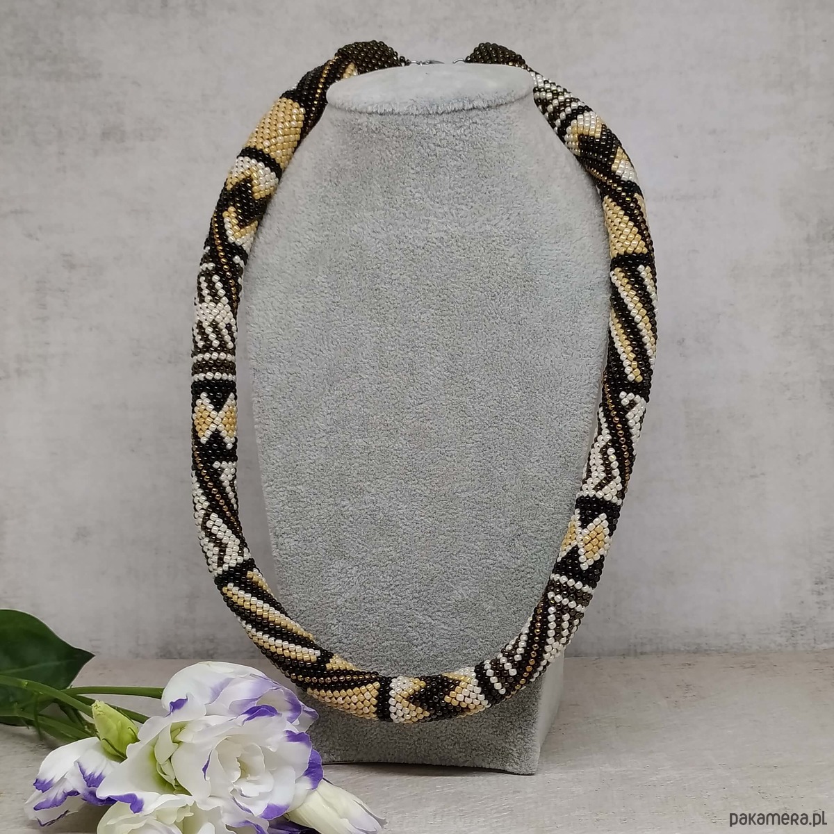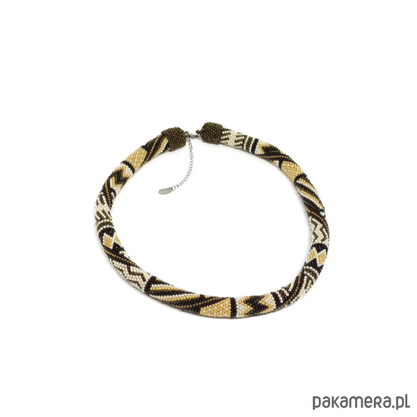 Koralikowy naszyjnik w którym wzory malują japońskie szklane koraliki w kolorze iris brown (ciemny brąz), czarnym, beżowym, kremowym i miedzianym. Wykończony końcówkami wykonanymi z koralików. Zapięcie stal chirurgiczna.