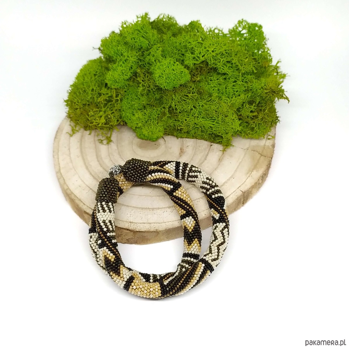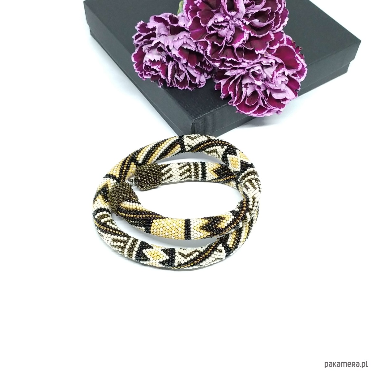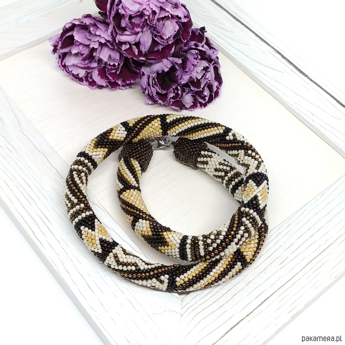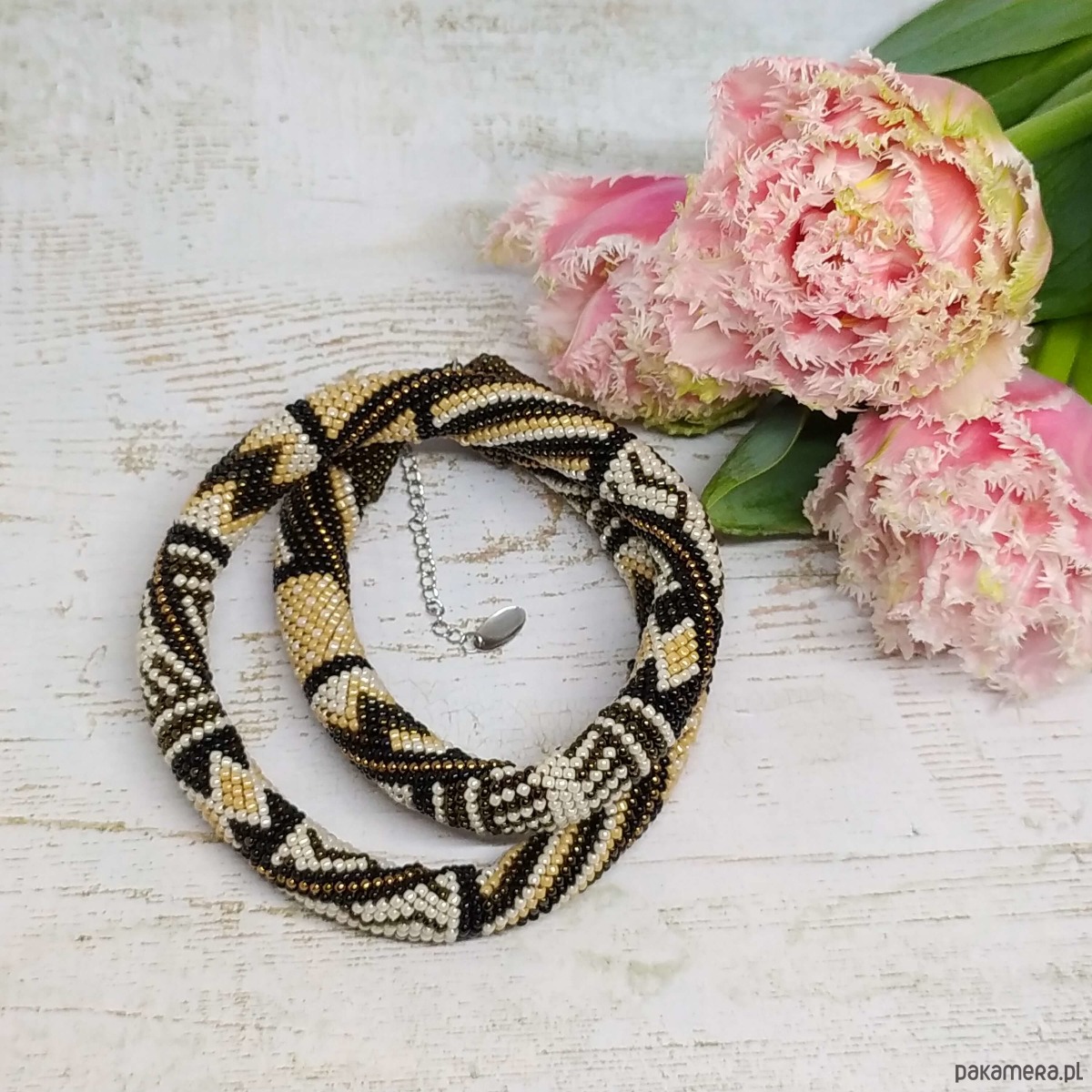 Koralikowy naszyjnik w którym wzory malują japońskie szklane koraliki w kolorze iris brown (ciemny brąz), czarnym, beżowym, kremowym i miedzianym. Wykończony końcówkami wykonanymi z koralików. Zapięcie stal chirurgiczna.