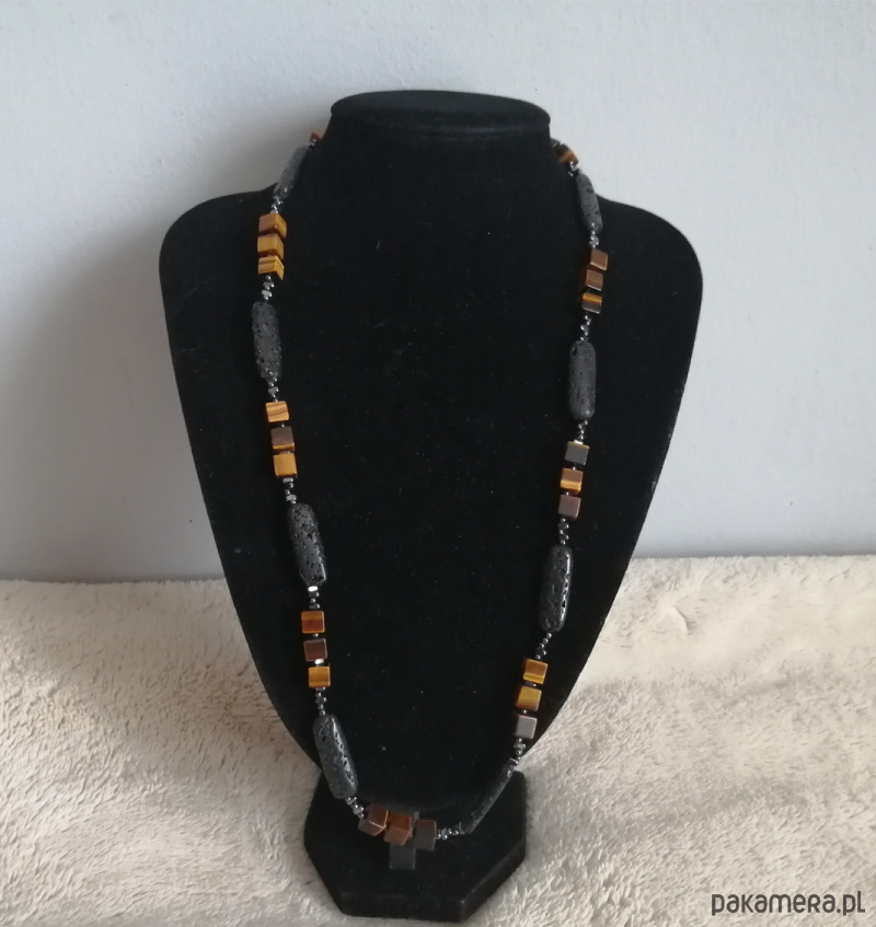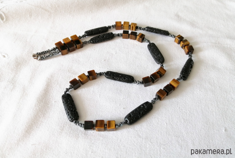 Długi naszyjnik wykonany z lawy, tygrysiego oka i hematytu.