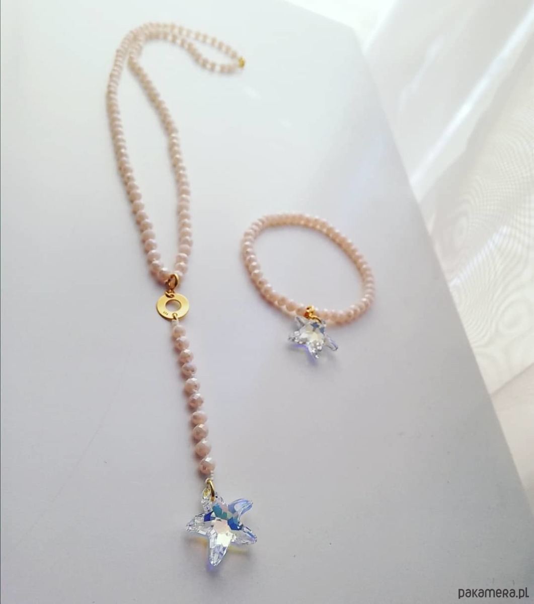 Naszyjnik z gwiazdą Swarovskiego, wykonany ze szkła kryształowego w kolorze kremowym, nawiniętym na cienki, trwały sznurek, zapinany na federing, a także elementów ze srebra 925 pozłacanego 24k złotem. Mieniąca się pod wpływem światła przezroczysta gwiazda kryształu Swarovskiego prezentuje się obłędnie i zjawiskowo.