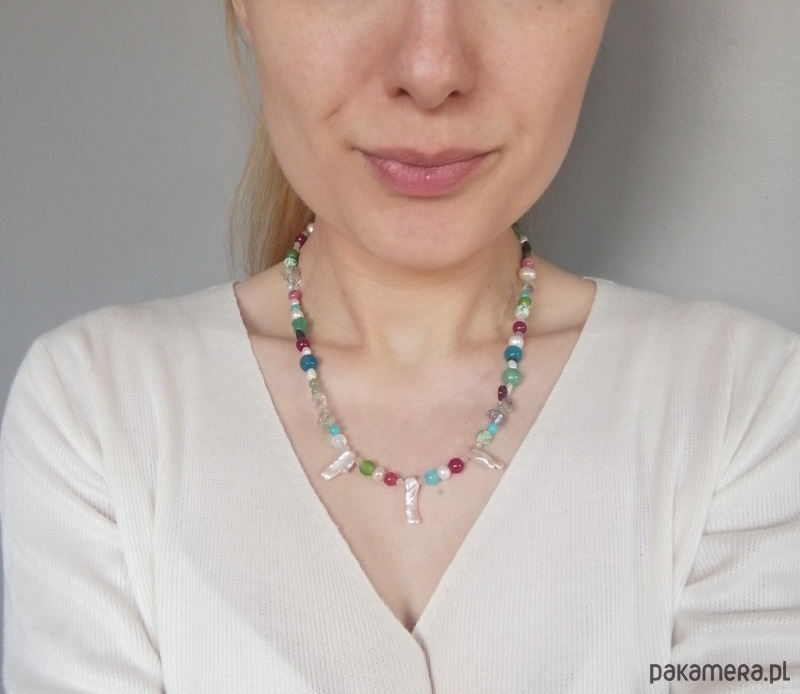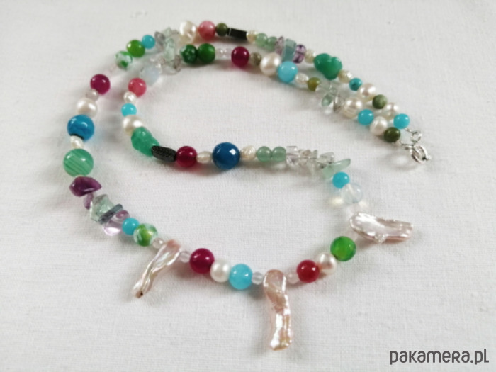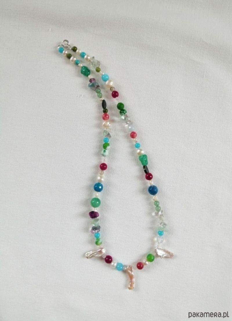 Naszyjnik wykonany z kamieni naturalnych (fluoryt, perły, chalcedon, agaty, kwarc różowy).