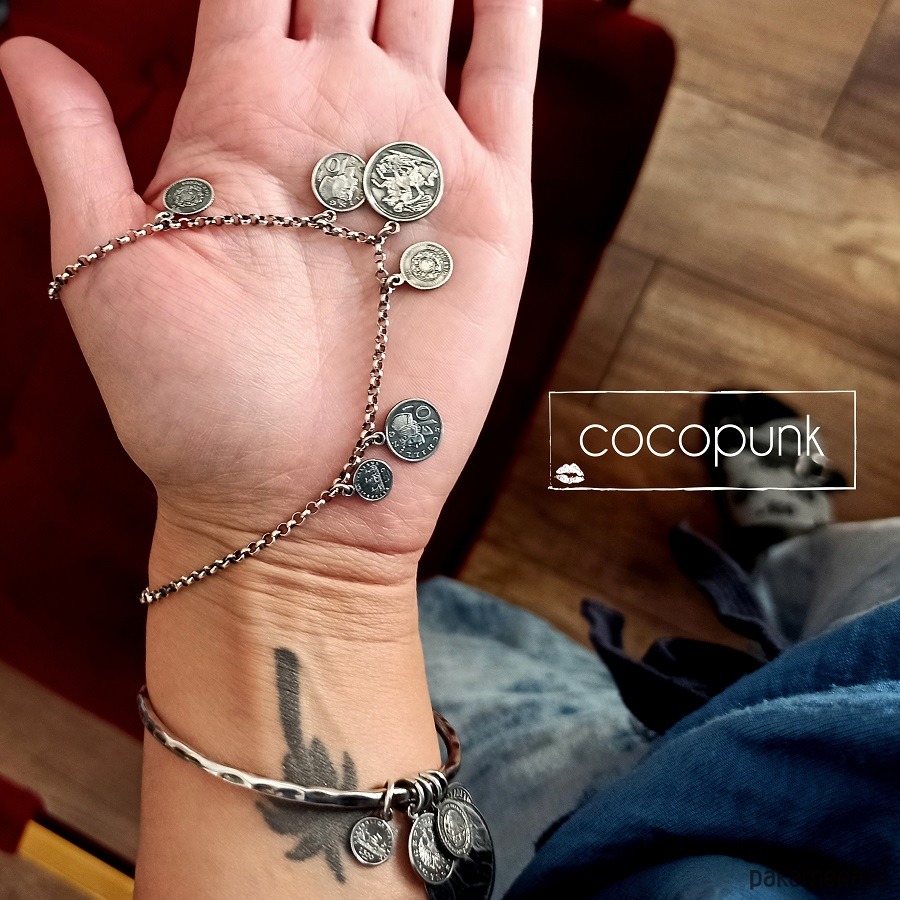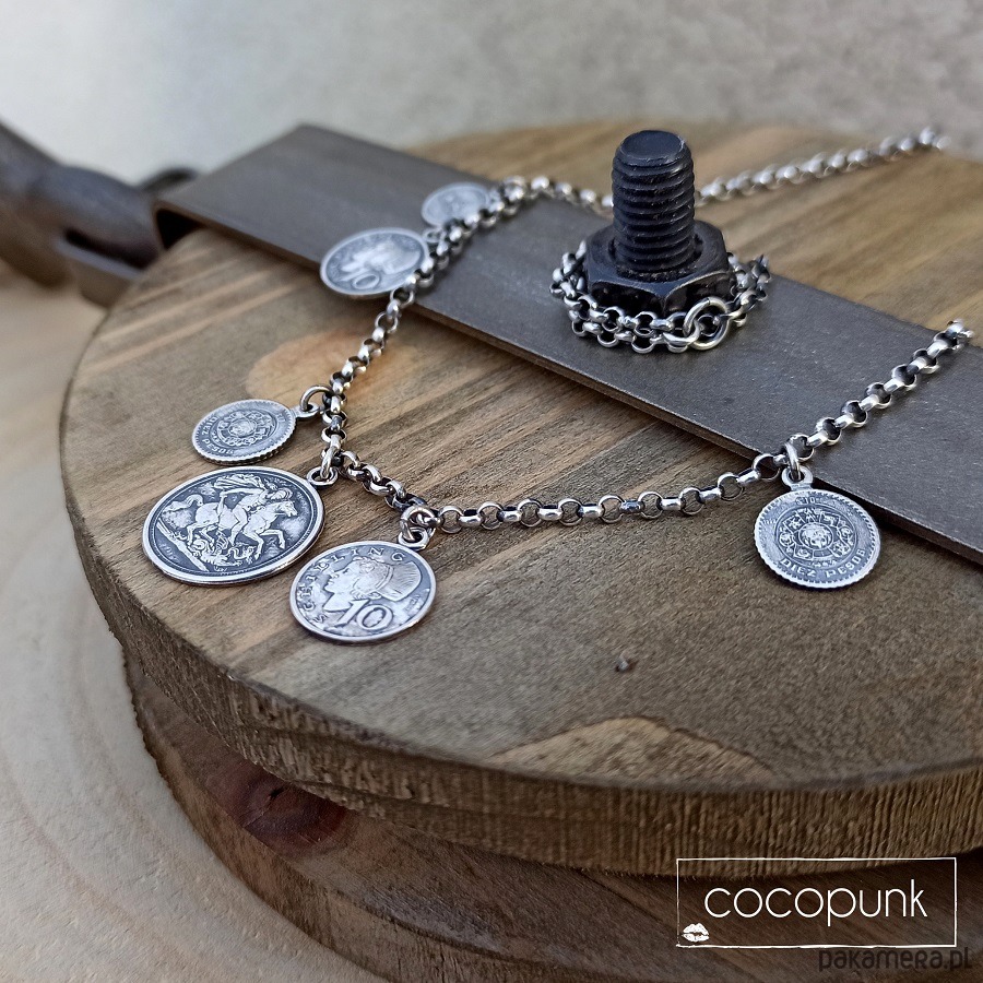 Nowoczesny naszyjnik wykonany w całości ze srebra pr. 925 (przyciemnianego i polerowanego). Nie jest to delikatny naszyjnik- grubość ogniwek łańcuszka wynosi 2,5mm, a całość jest konkretna i wyrazista. Wielkość dwustronnych monetek : 1-1,7cm a ich wzór może się nieznacznie różnić od tego na zdjęciu. Całkowita długość naszyjnika : 44cm plus 5cm łańcuszka regulacyjnego. W galerii znajdziecie Państwo bransoletkę do kompletu.