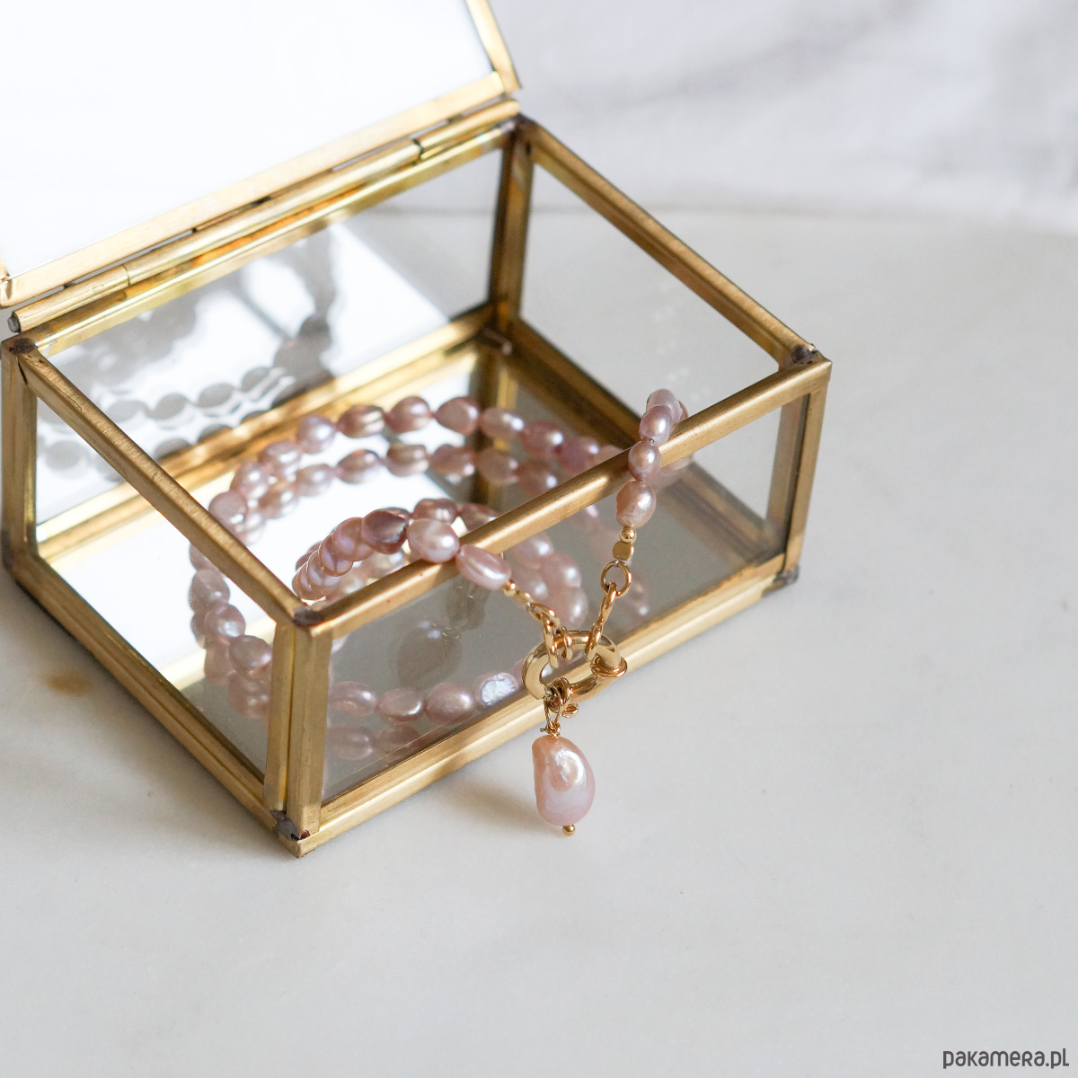 Naszyjnik można zamówić w wersji pozłacanej lub srebrnej. Wszystkie elementy są wykonane ze srebra próby 925 lub tego srebro pokrytego 24k złotem. Perły są nawleczone na jedwabną nić.