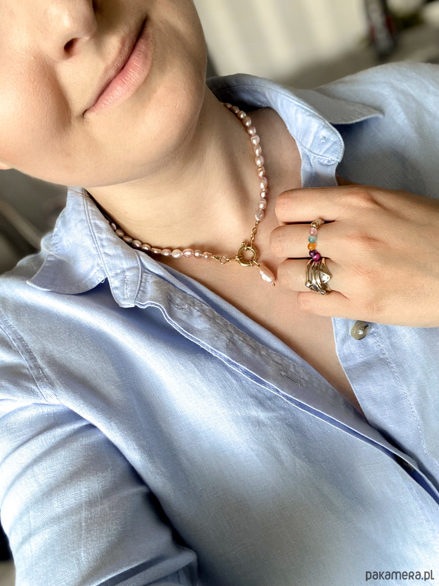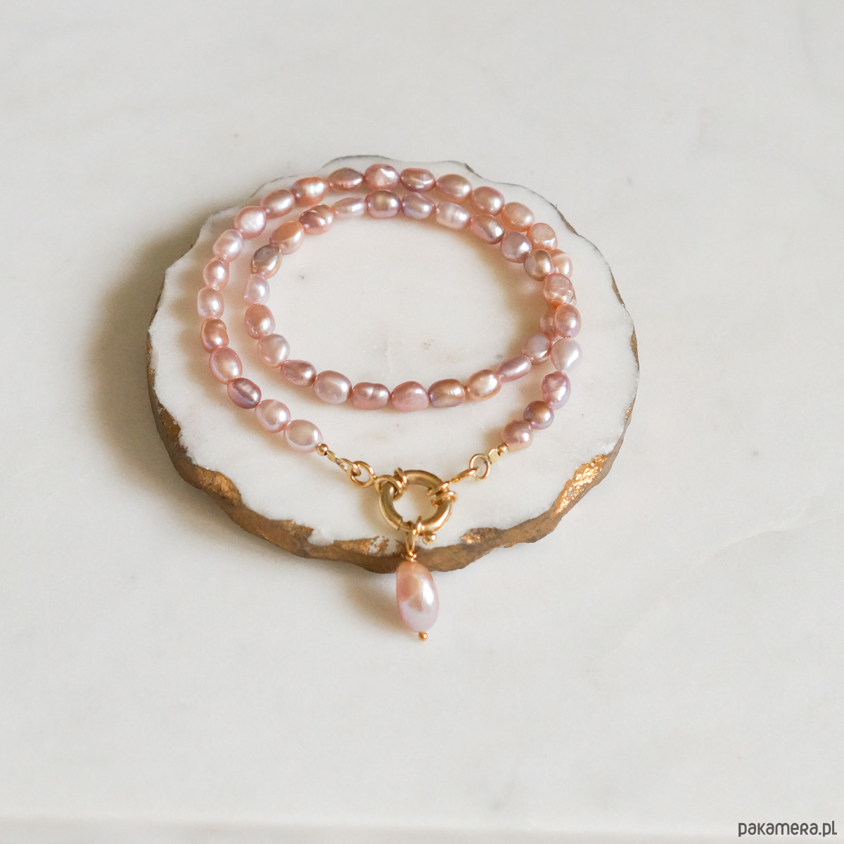 Naszyjnik z różowych pereł słodkowodnych o średnicy ok.6mm oraz ozdobnego dużego zapięcia i zawieszki wykonanej z dużej perły w tym samym odcieniu.
