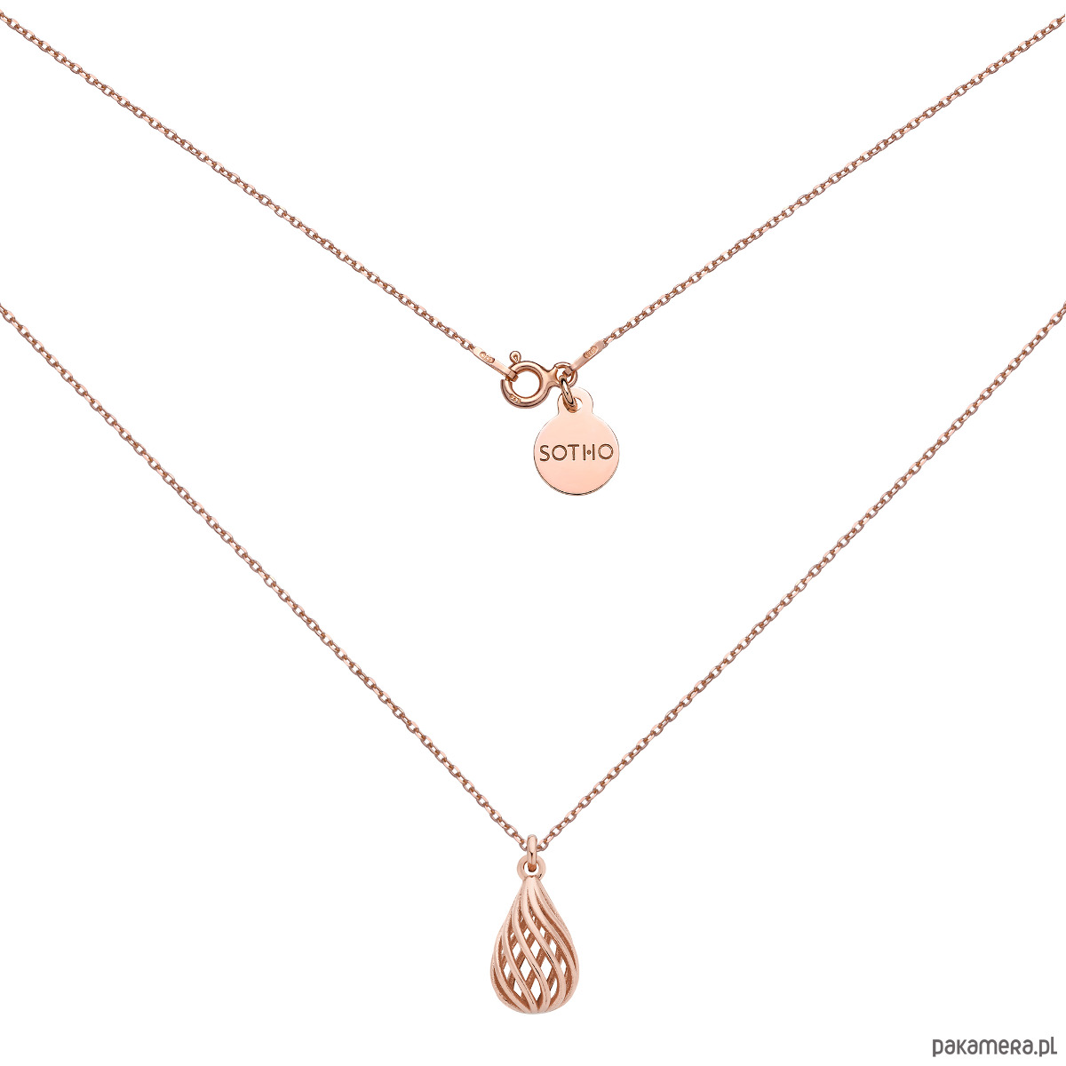 Złoty naszyjnik z ażurową zawieszką i zawieszką z logo marki. Całość wykonana ze srebra 925 powlekanego 24 karatowym różowym złotem.