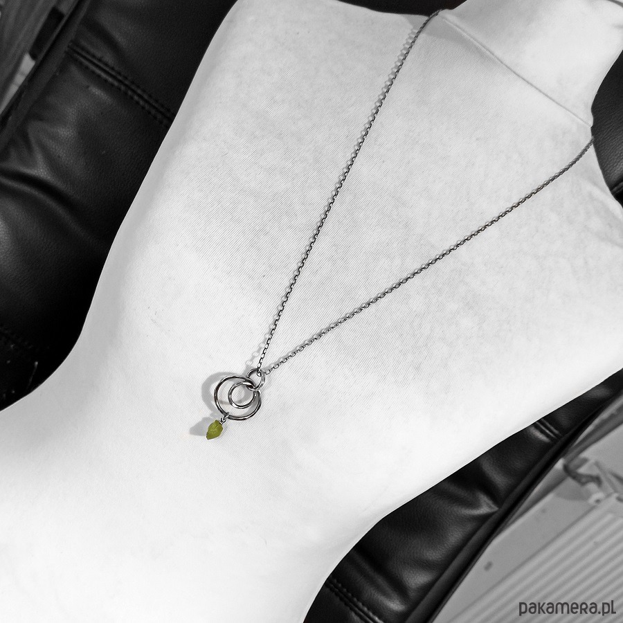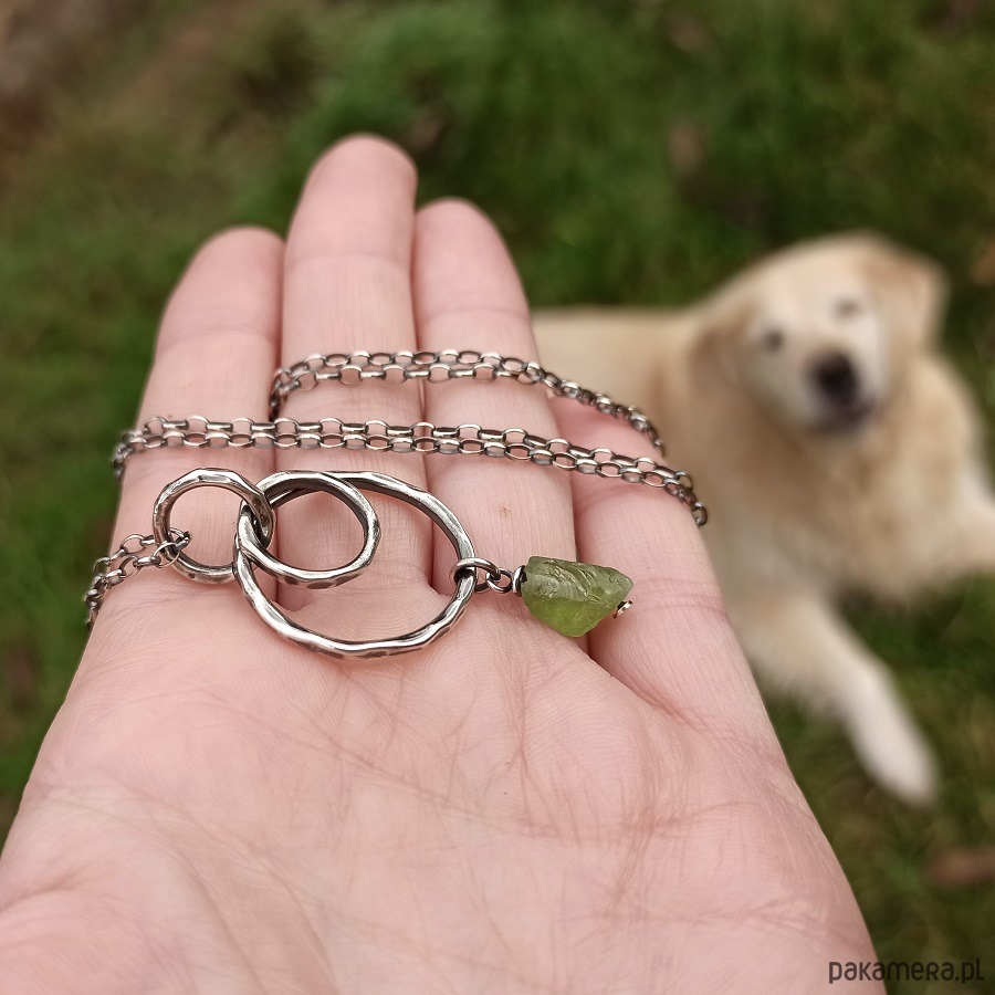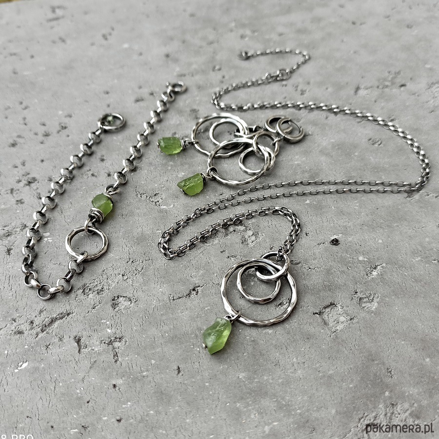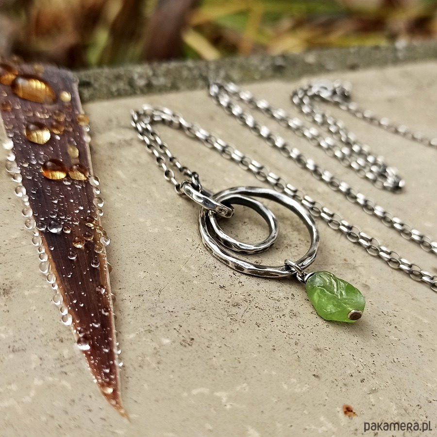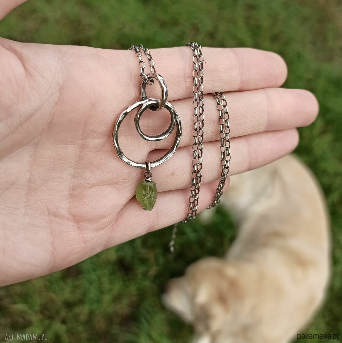 Długi, nowoczesny naszyjnik wykonany w całości ze srebra pr. 925 ( przyciemnianego i polerowanego). Ręcznie kute, młotkowane kółka maja wielkość 1,2- 2,5cm. Dodatkowo zdobi go surowa, nieregularna bryłka szlachetnego peridotu - ok. 1cm. Długość całkowita zawieszki- 4,5cm. Długość łańcuszka- 70cm plus 5cm regulacji.