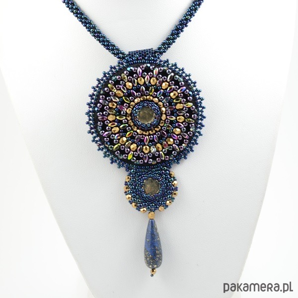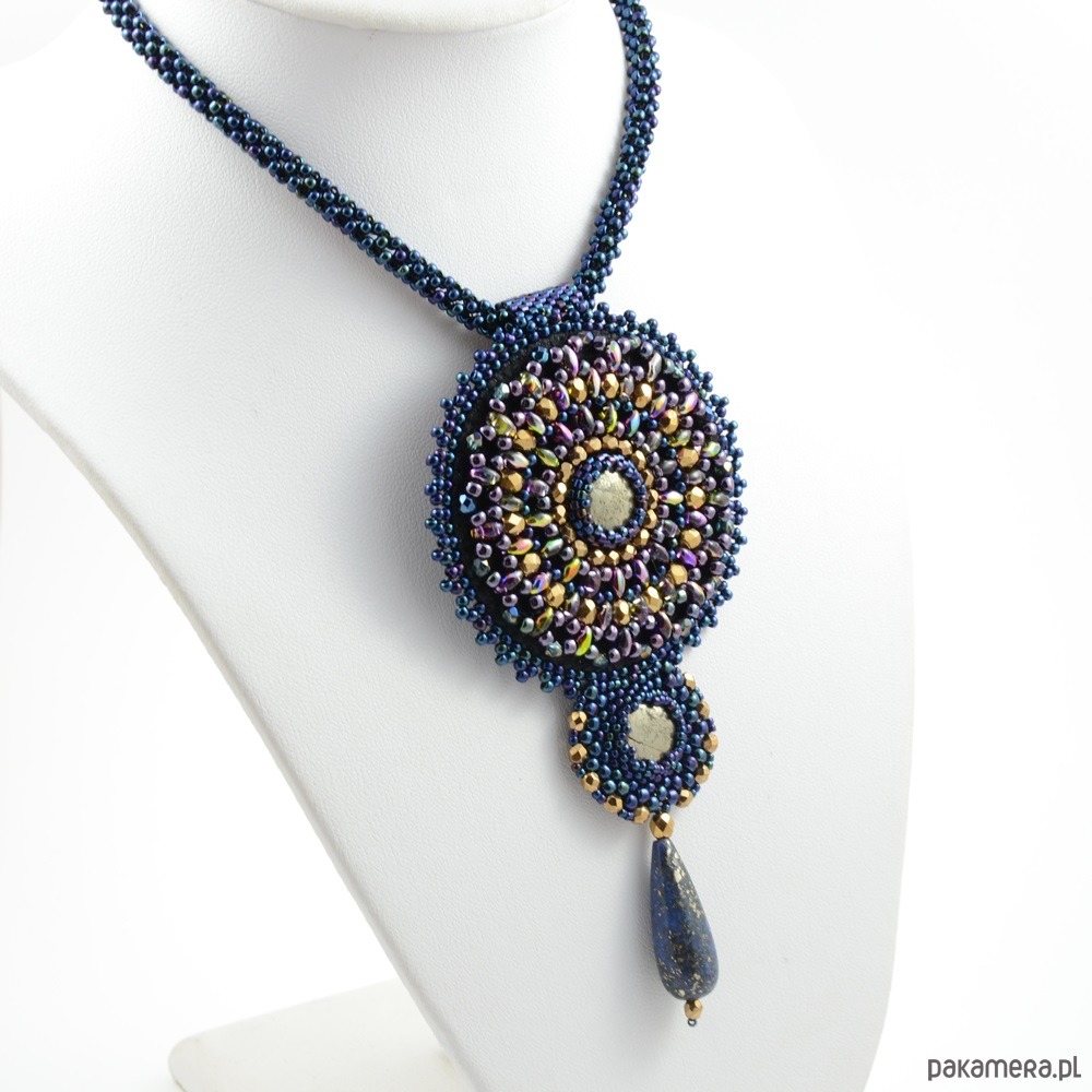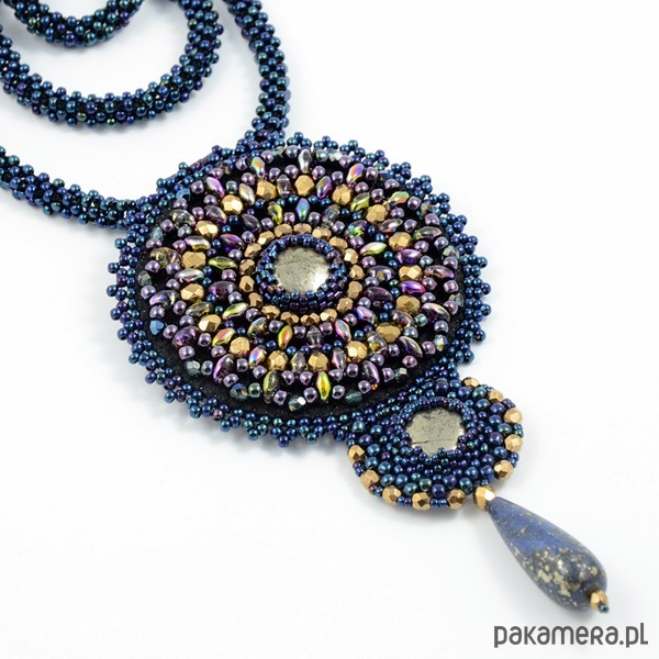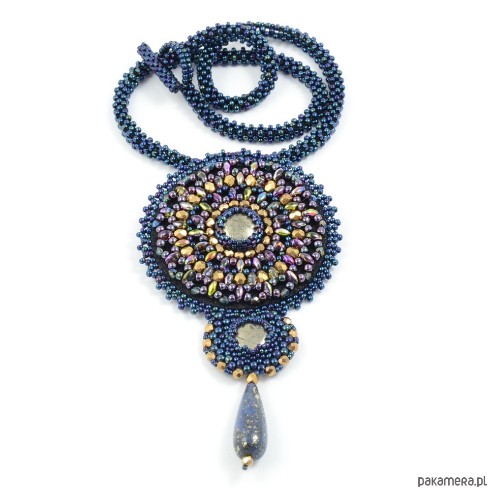Niezwykły, przyciągający wzrok naszyjnik wykonany w technice haftu koralikowego. Serce haftu stanowi pastylka pirytu w koronkowej otoczce z koralików Toho, kryształków Fire Polish i Superduo, misternie wpasowane w okrąg. Spód podszyty czarną skórką licową. Element przedłużający wisior- druga pastylka pirytu została zapleciona w koraliki, przód i tył plecionki jest podobny. Smaku dodaje podwieszona spora kropla lapis lazuli z pirytem. Całkowita długość wisiora 11,5 cm, średnica głównego elementu 6 cm. Sznur służący do zawieszenia razem z zapięciem typu toggle od podstaw wypleciony z koralików techniką igłową. Długość 48 cm.