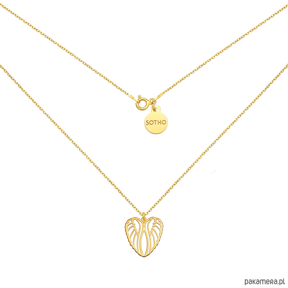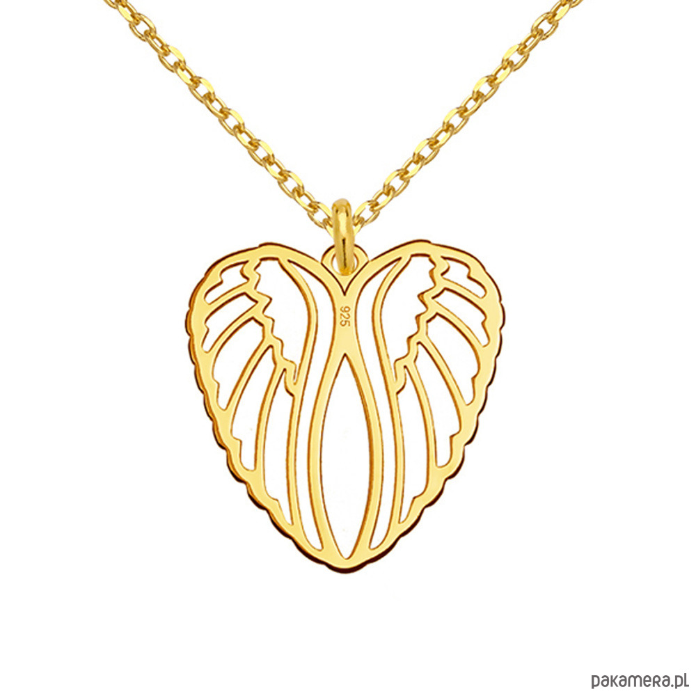 Złoty naszyjnik łańcuszkowy zdobiony skrzydełkami w kształcie sercem i zawieszką z logo marki. Całość wykonana ze srebra 925 powlekanego 24 karatowym żółtym złotem.