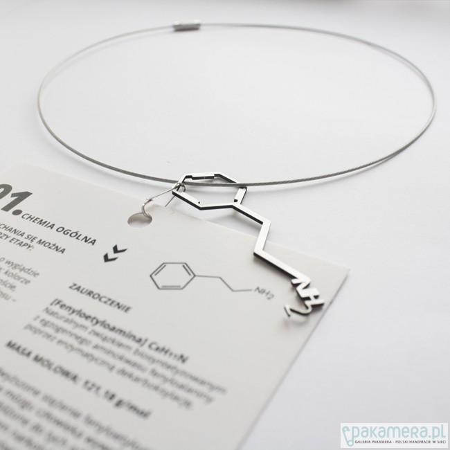 NASZYJNIK 01. MIŁOŚĆ TO BIŻUTERIA WYKONANA ZE STALI KWASOODPORNEJ. JEJ FORMA INSPIROWANA JEST WZOREM CHEMICZNYM FENYLOETYLOAMINY PRODUKOWANEJ W LUDZKIM MÓZGU, ODPOWIADAJĄCEJ ZA ODCZUCIA TOWARZYSZĄCE STANOWI ZAKOCHANIA M.IN. EUFORII, PRZYŚPIESZONEMU BICIU SERCA, WZMOŻONEJ PEWNOŚCI SIEBIE... W SKŁAD KOMPLETU WCHODZI ZAWIESZKA ORAZ STRUNA JUBILERSKA. WYMIARY ELEMENTU: DŁUGOŚĆ / 5,7 CM SZEROKOŚĆ / 1,7 CM