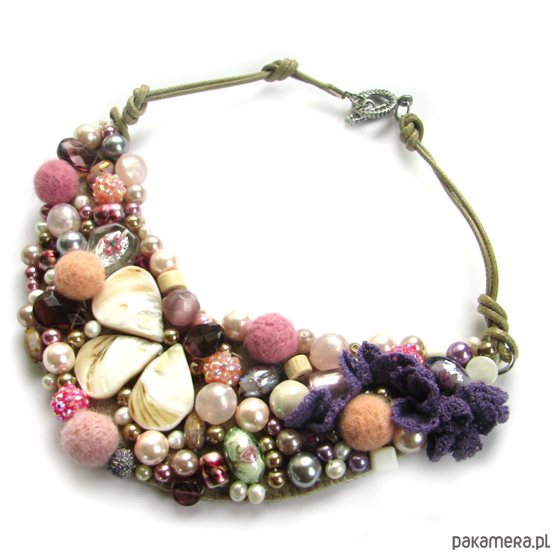 Kolia w całości wykonana ręcznie. Na filcowym podkładzie znalazły się korale filcowe, korale lampwork, korale szklane, perły, muszle, wydziergana szydełkiem z cienkiej nitki koronka. Wszystko to daje efekt eleganckiej, bogato zdobionej, wyjątkowej kolii wykonanej tylko w 1 egzemplarzu.