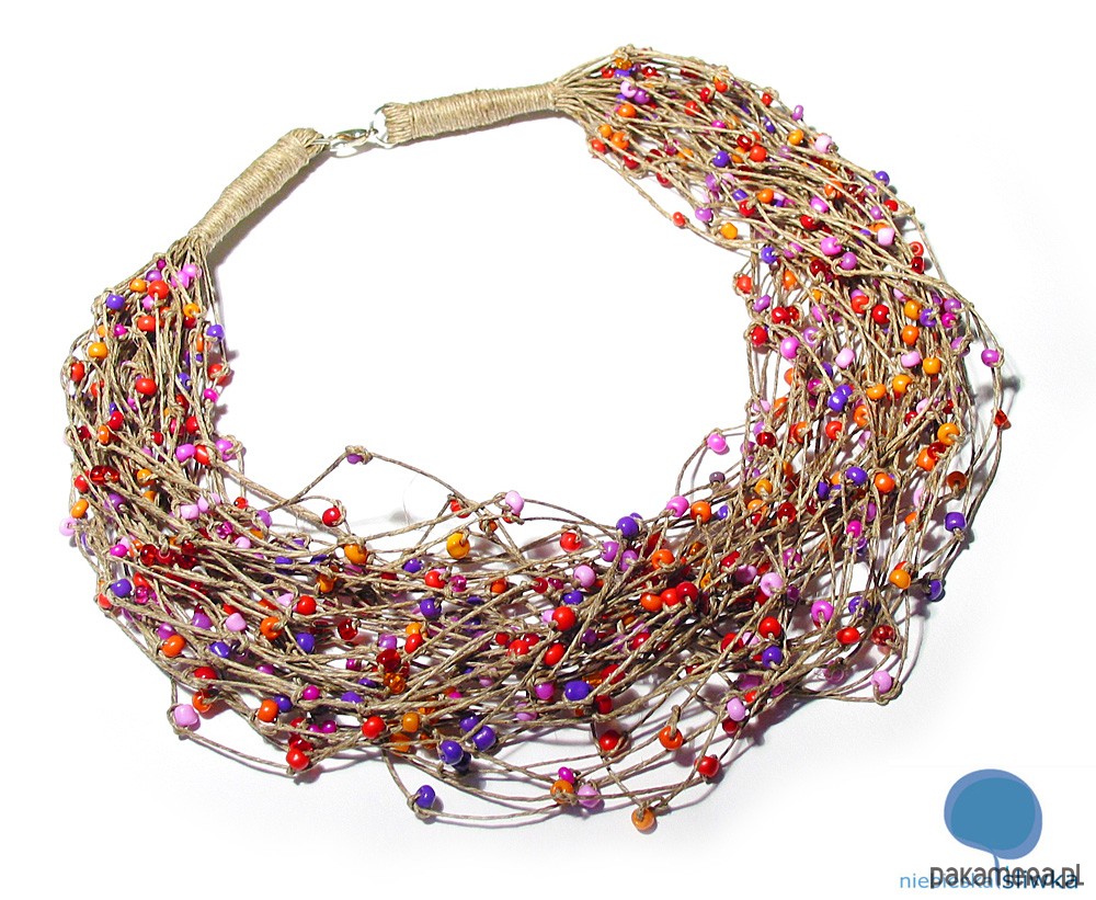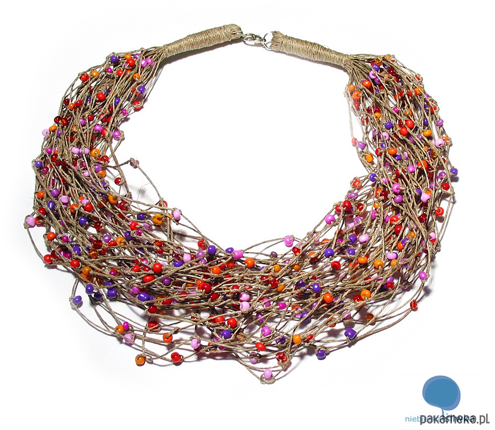 Letnia i pełna pozytywnej energii kolia wykonana na kilkudziesięciu sznurkach naturalnej przędzy lnianej z setkami wielobarwnych drobniutkich misternie wplecionych koralików szklanych Jablonex. Długość kolii mierzona po zapięciu ok. 50 cm , zapięcie posrebrzany karabińczyk. --------------------------------------------------------------------------------------------------- Wzór i projekt są strzeżone prawami autorskimi. Kopiowanie jest zabronione.